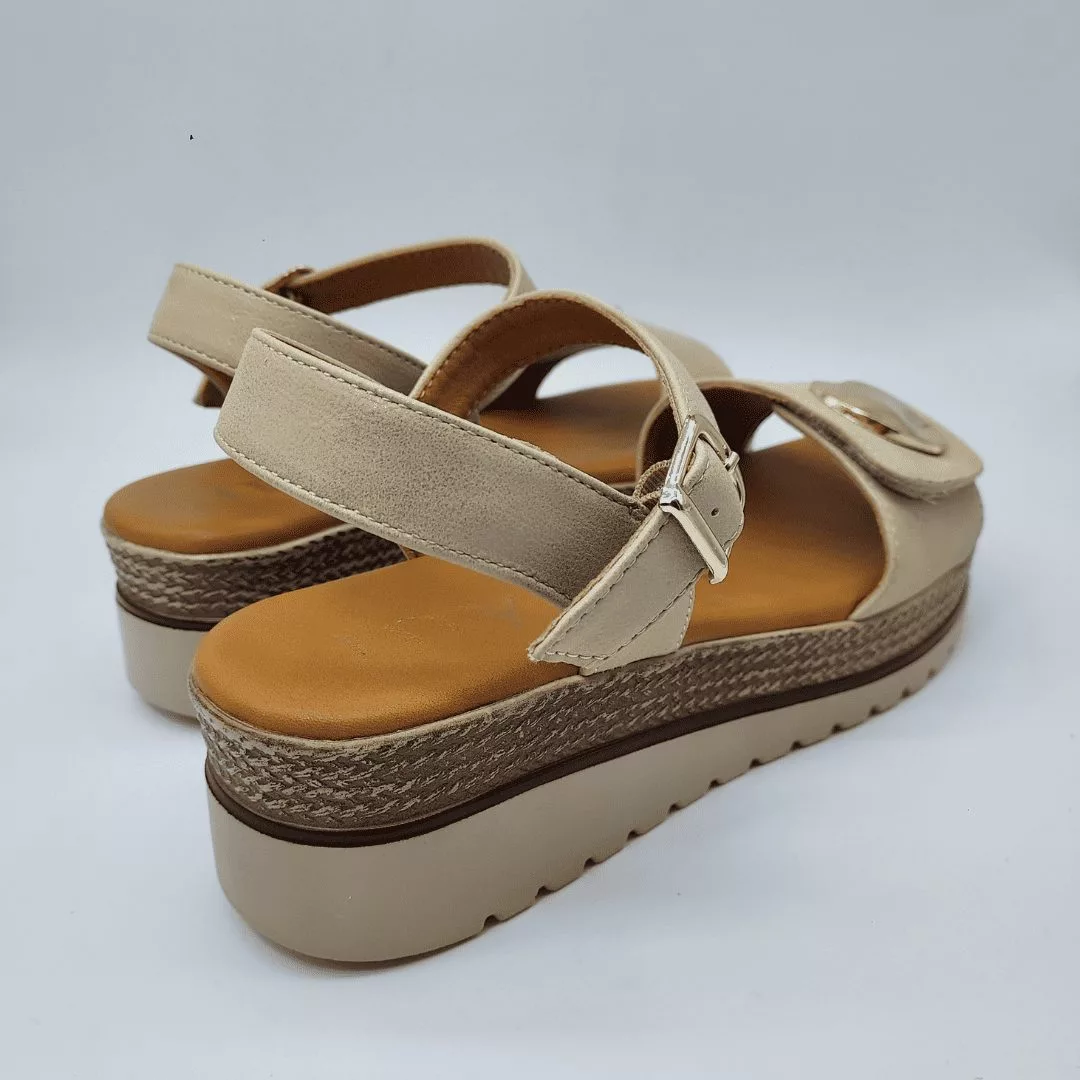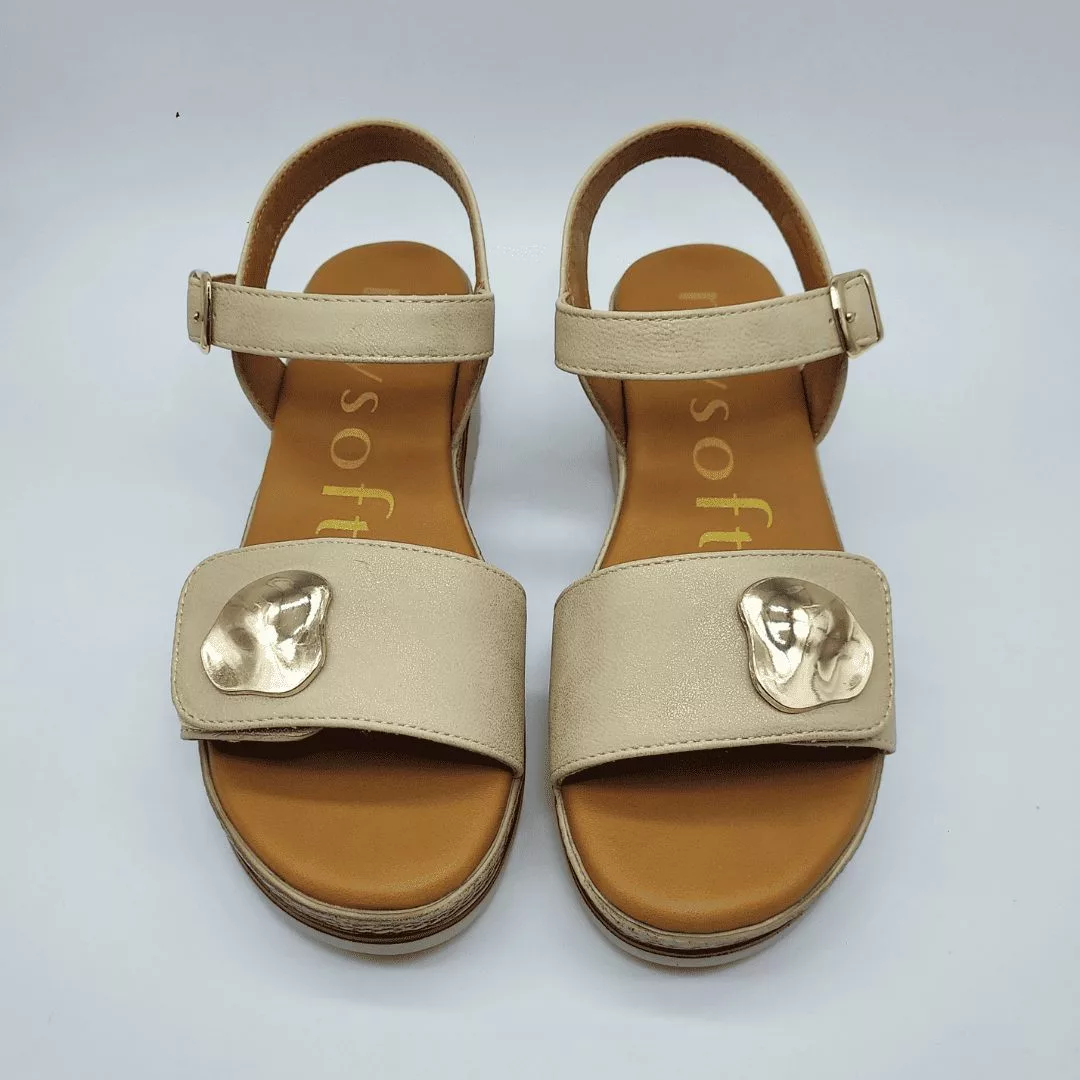 Mysoft Mod. 26M190, Sandalia con Cuña fabricada en Tejido Fantasía acabado Arena, Cierre mediante Velcro en Pala con Aplique en Dorado y con Cierre tipo pulsera mediante hebilla en tobillo. Cuña de 4,5 cm de altura y Plataforma de 2,5 cm. Plantilla Mysoft Memory Foam.