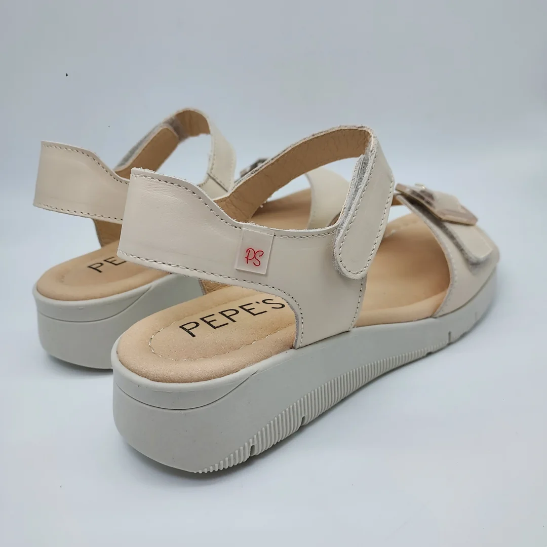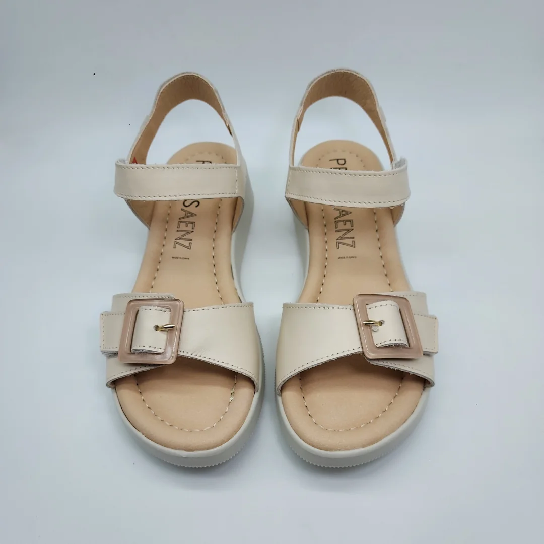 Pepe Sáenz Mod. 10490, Sandalia en Piel de Vacuno acabado color Hielo, Planta Anatómica. Con Plataforma de 3,5 cm en trasera y 1 cm en delantera. Cierre mediante Velcro con detalle de Hebilla en Tira Delantera y Velcro en Trasera. Hecha en España.
