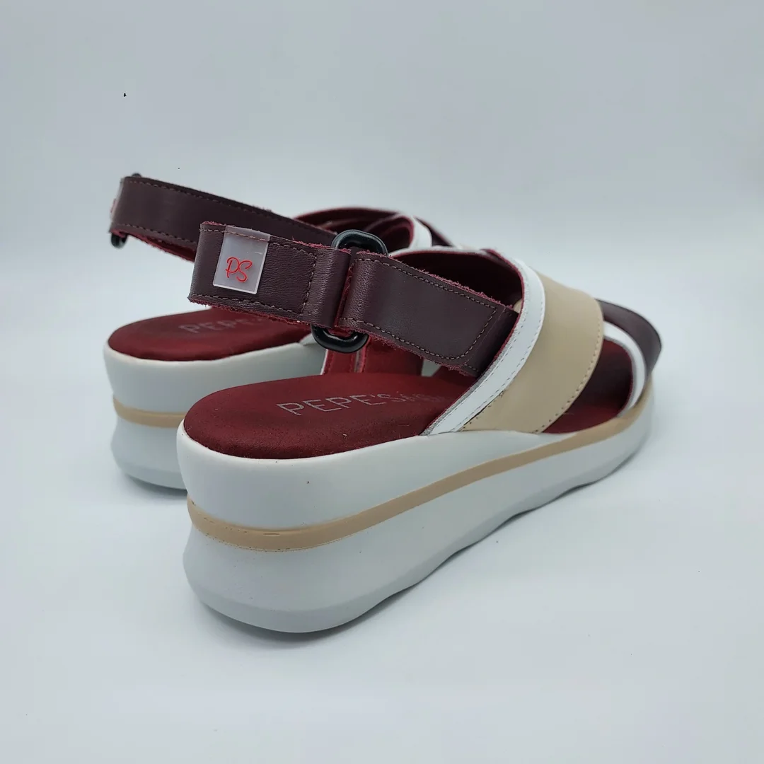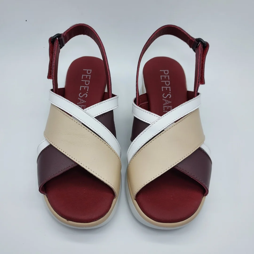 Pepe Sáenz Mod. 11143, Sandalia de Tiras Cruzadas en Piel de Vacuno acabado color Burdeos combinado con Blanco y Beige, Planta Anatómica. Con Plataforma de 4,5 cm en trasera y 1,5 cm en delantera. Cierre mediante Velcro Regulable en Tobillo. Hecha en España.