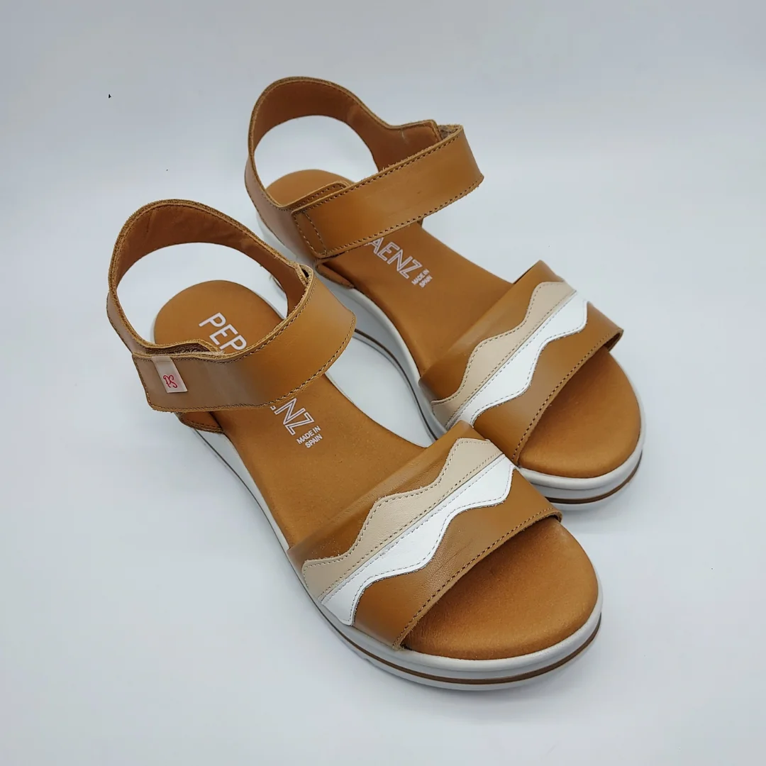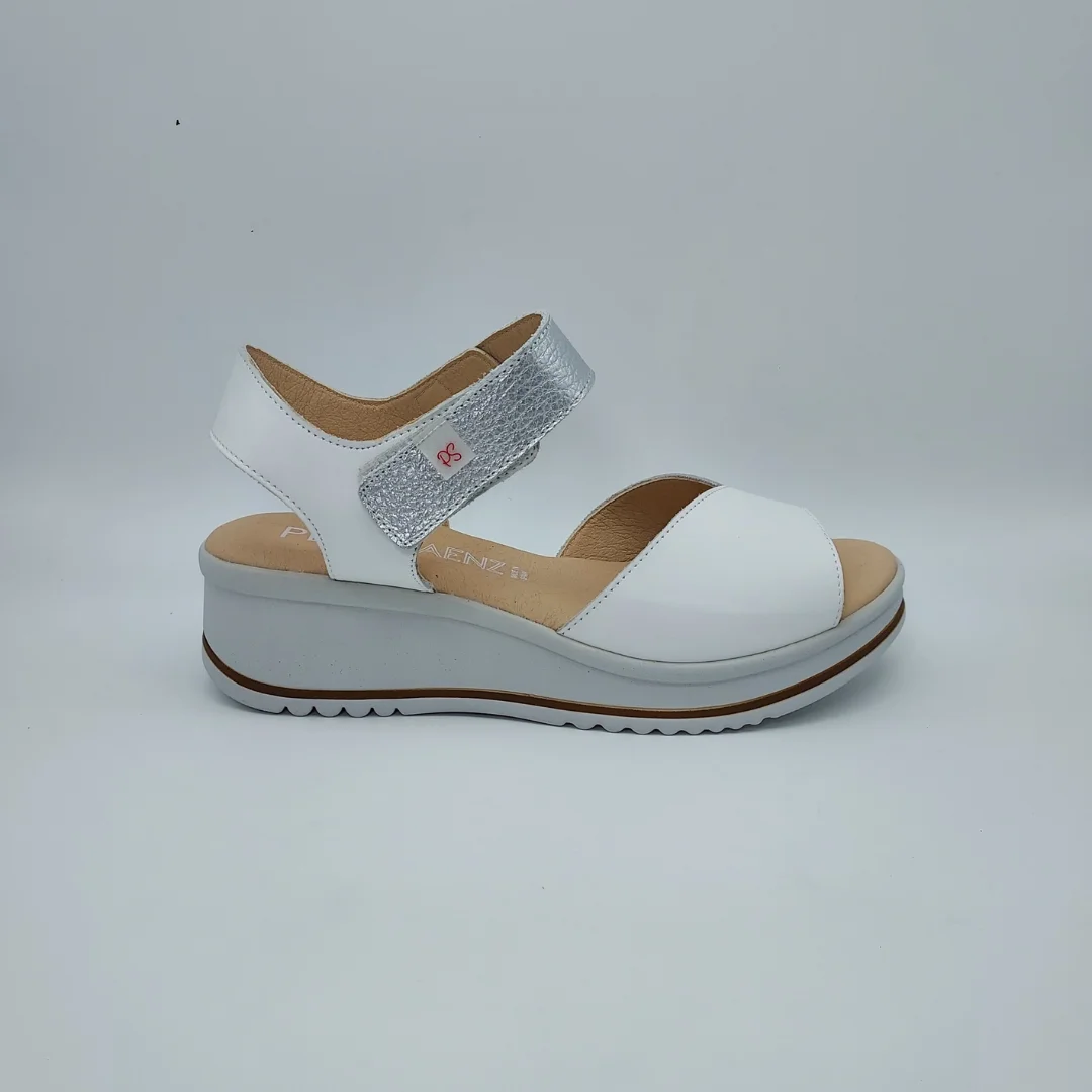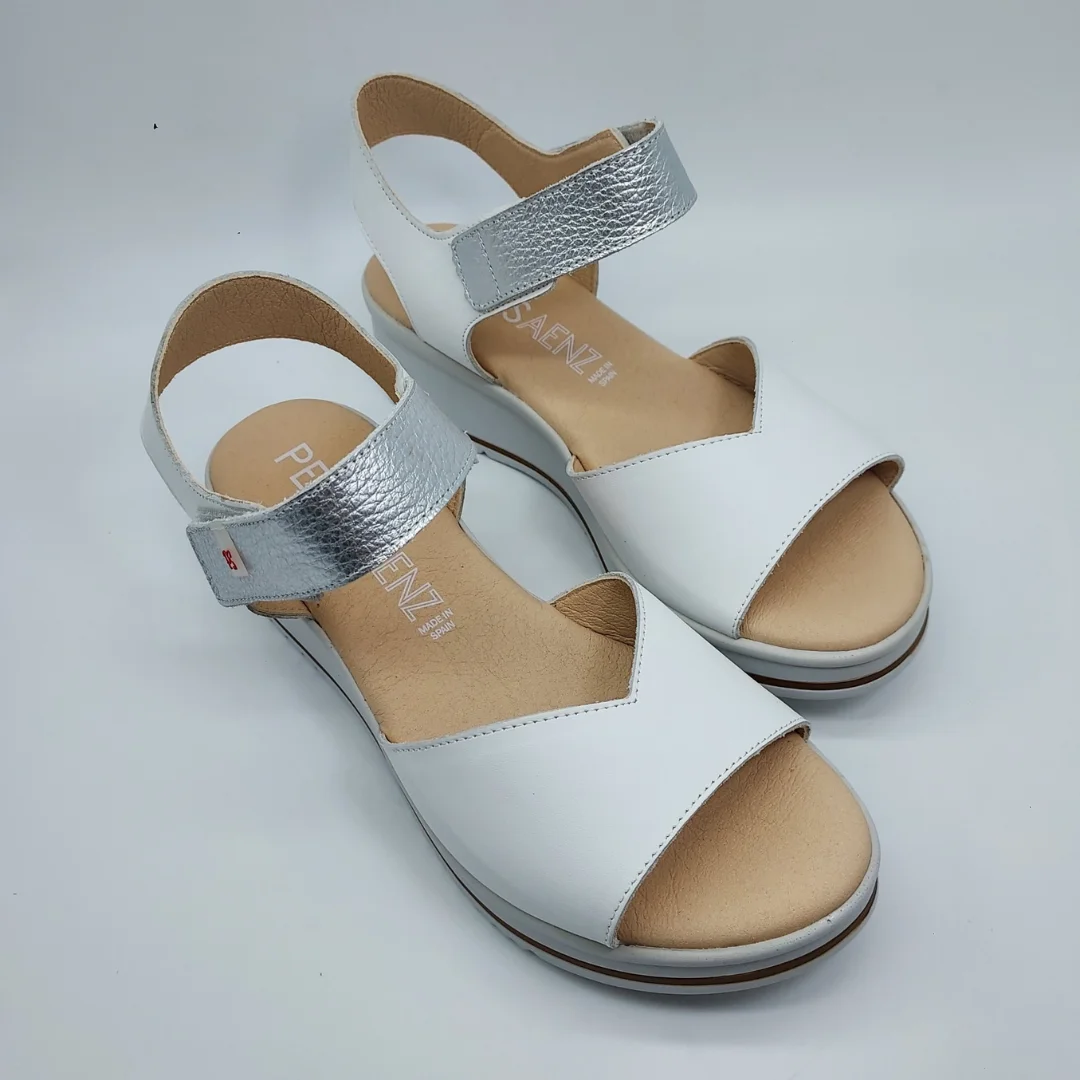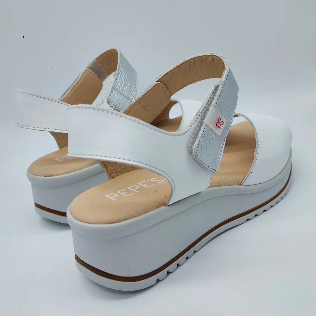 Pepe Sáenz Mod. 11150, Sandalia en Piel Lisa de Vacuno acabado color Blanco combinada con Piel Grabada en Plata, Planta Anatómica. Con Plataforma en color Hielo de 3,5 cm en trasera y 1,5 cm en delantera, con detalle en color Cuero. Cierre mediante Velcro. Hecha en España.