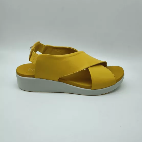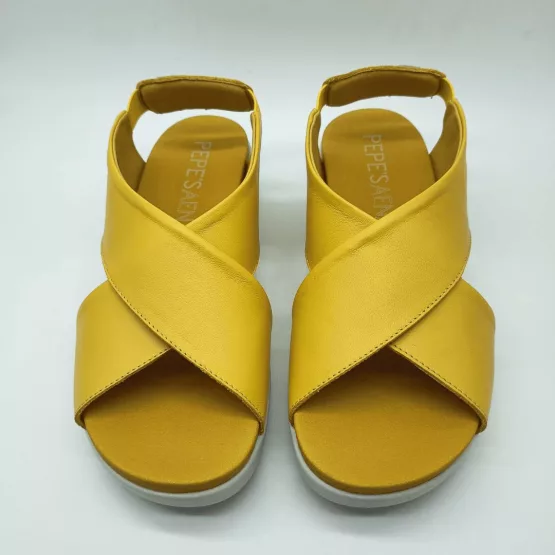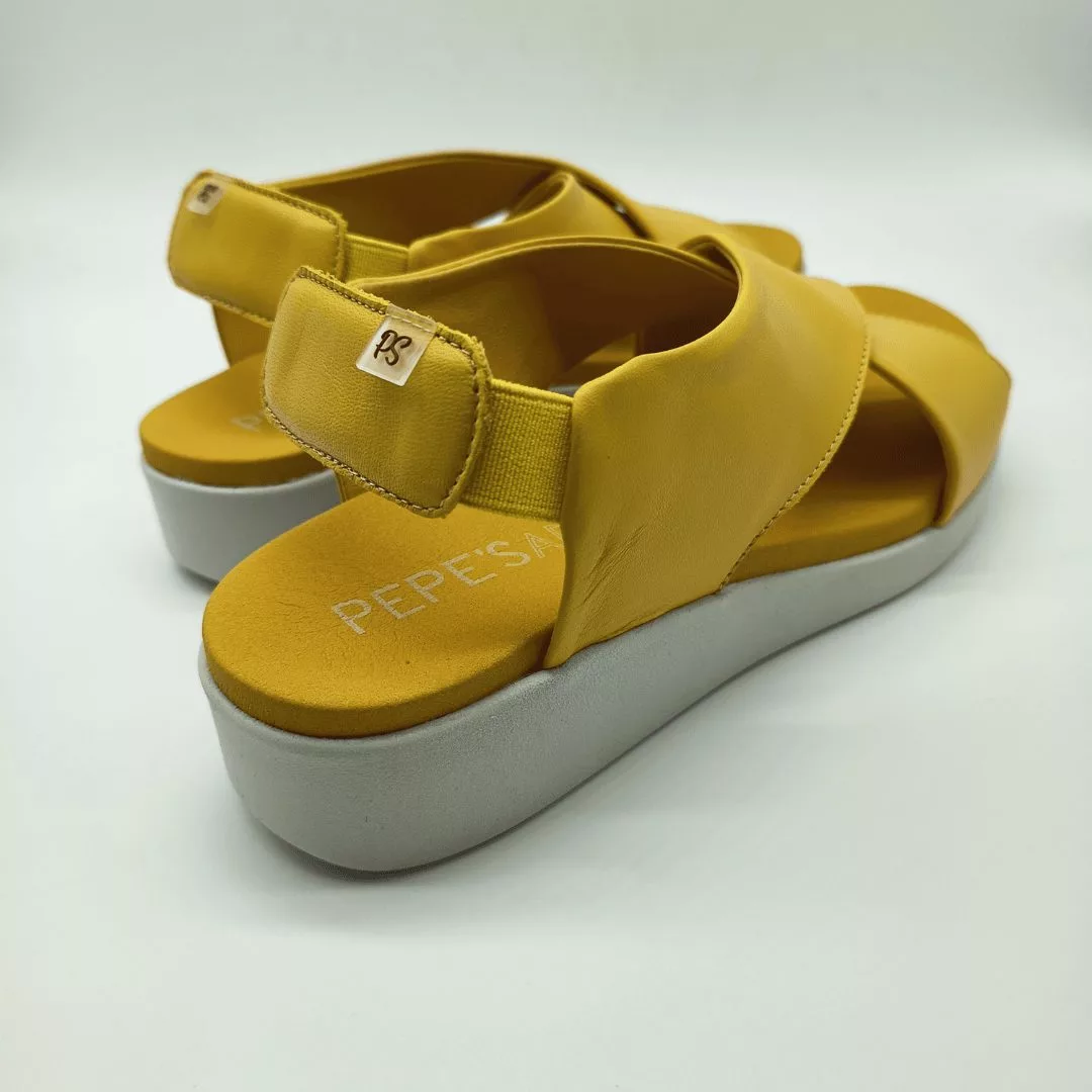 Pepe Sáenz Mod. PS10503, Sandalia de Tiras Cruzadas en Piel Vacuno, acabado color Sun, Plantilla Anatómica. Con Plataforma de 3,5 cm en trasera y 1,5 cm en delantera. Cierre de tira elástica posterior para un ajuste perfecto. Hecha en España.