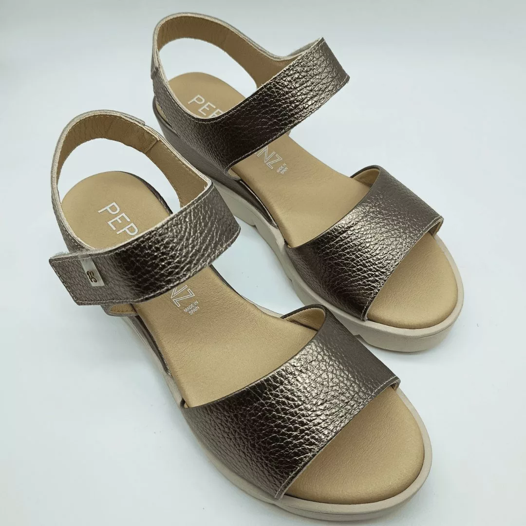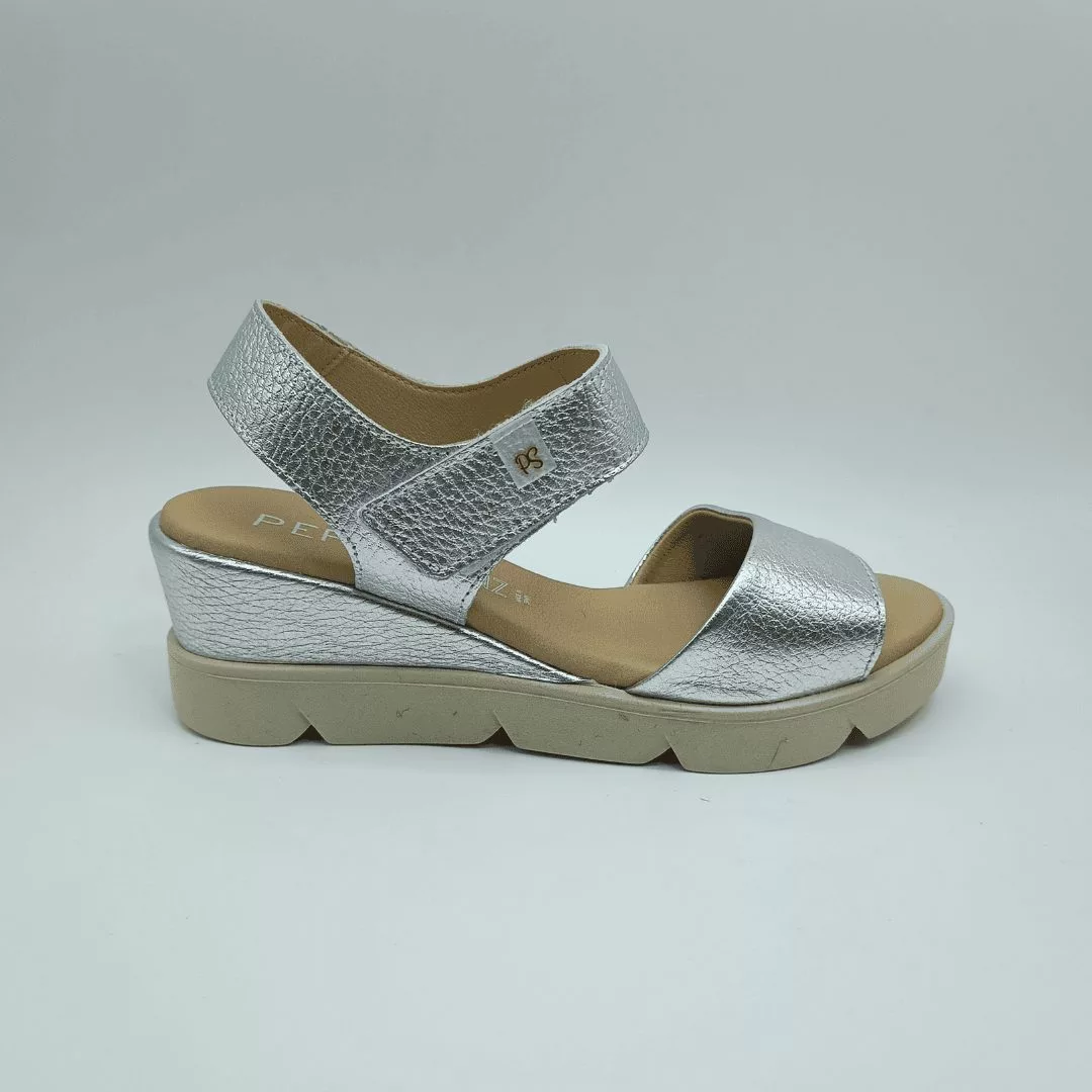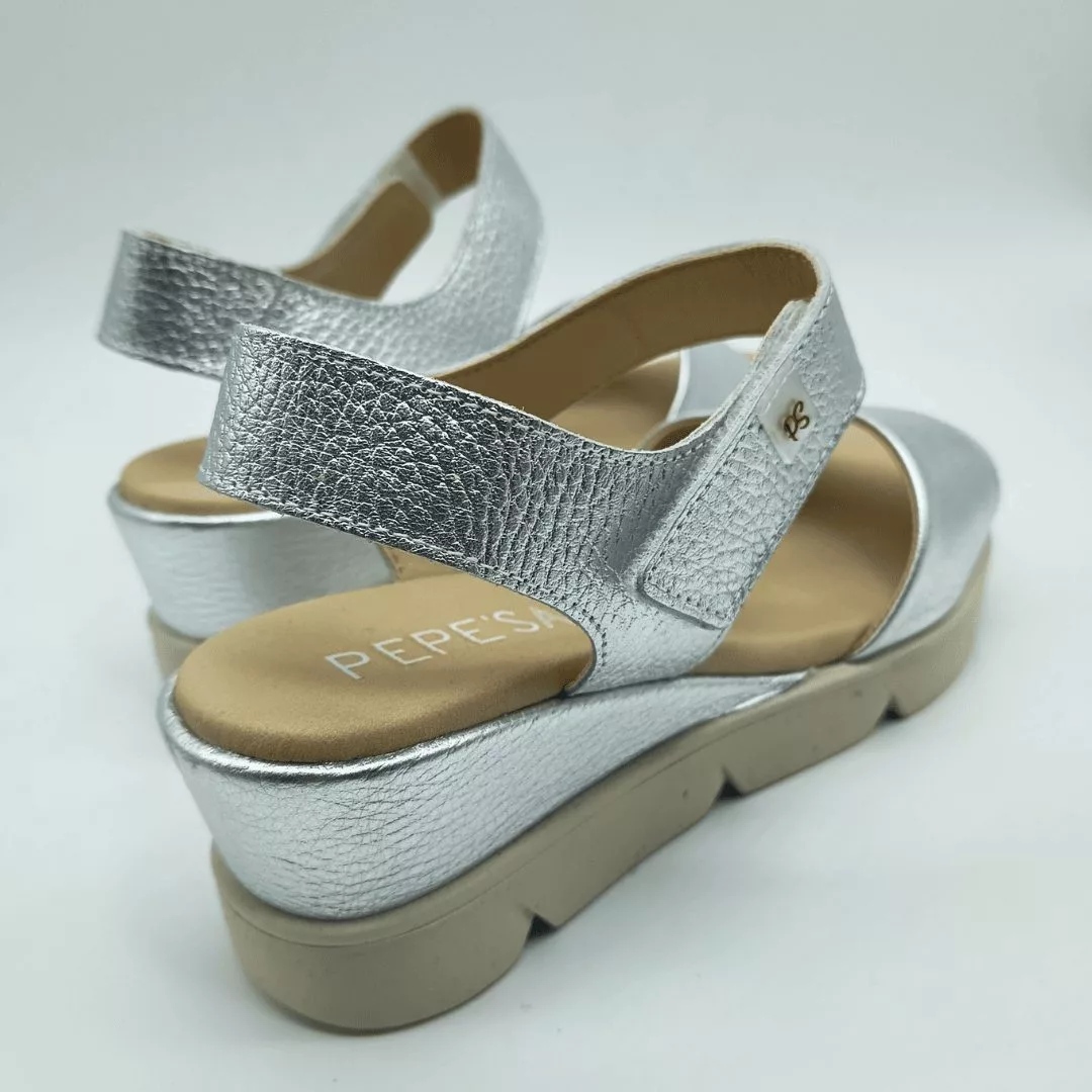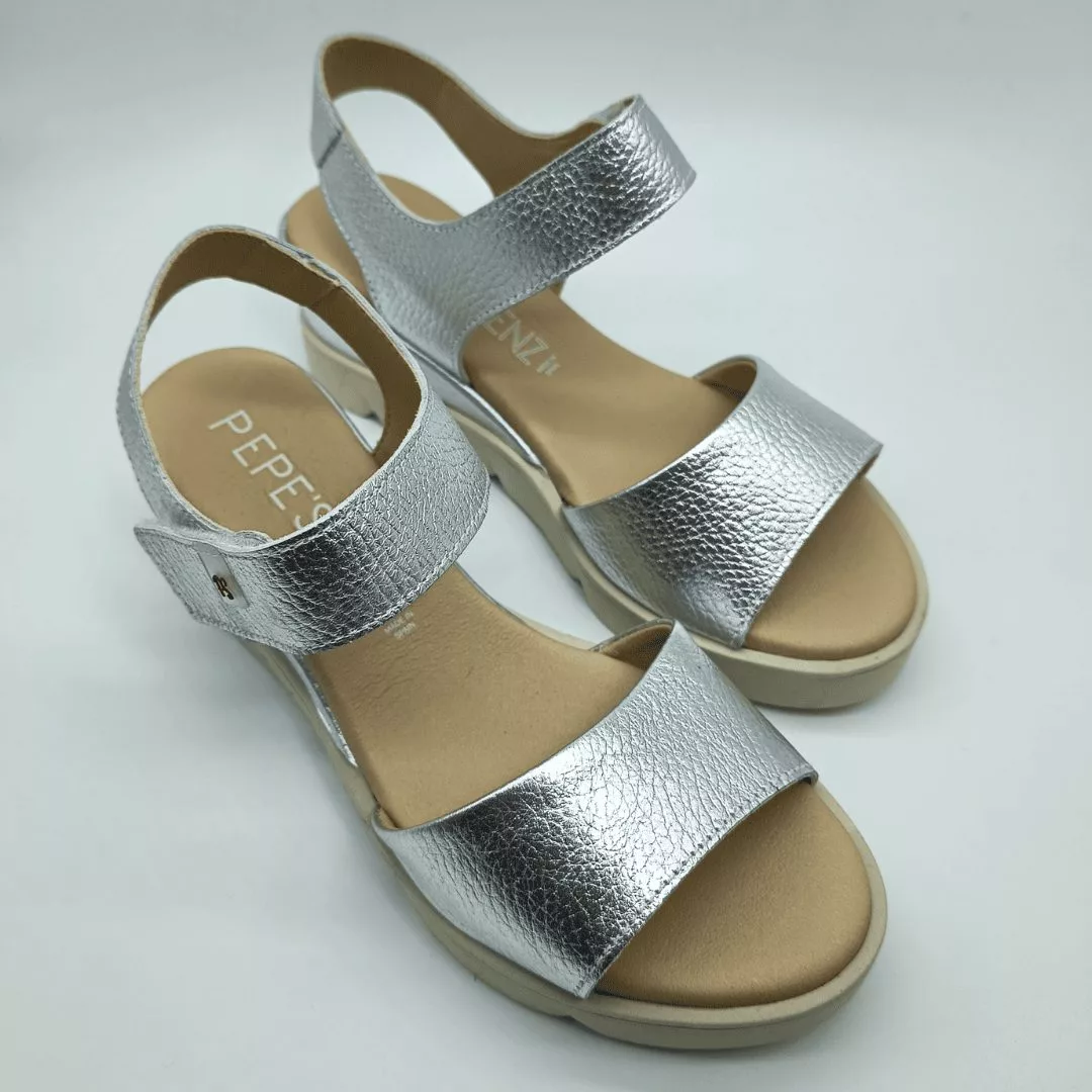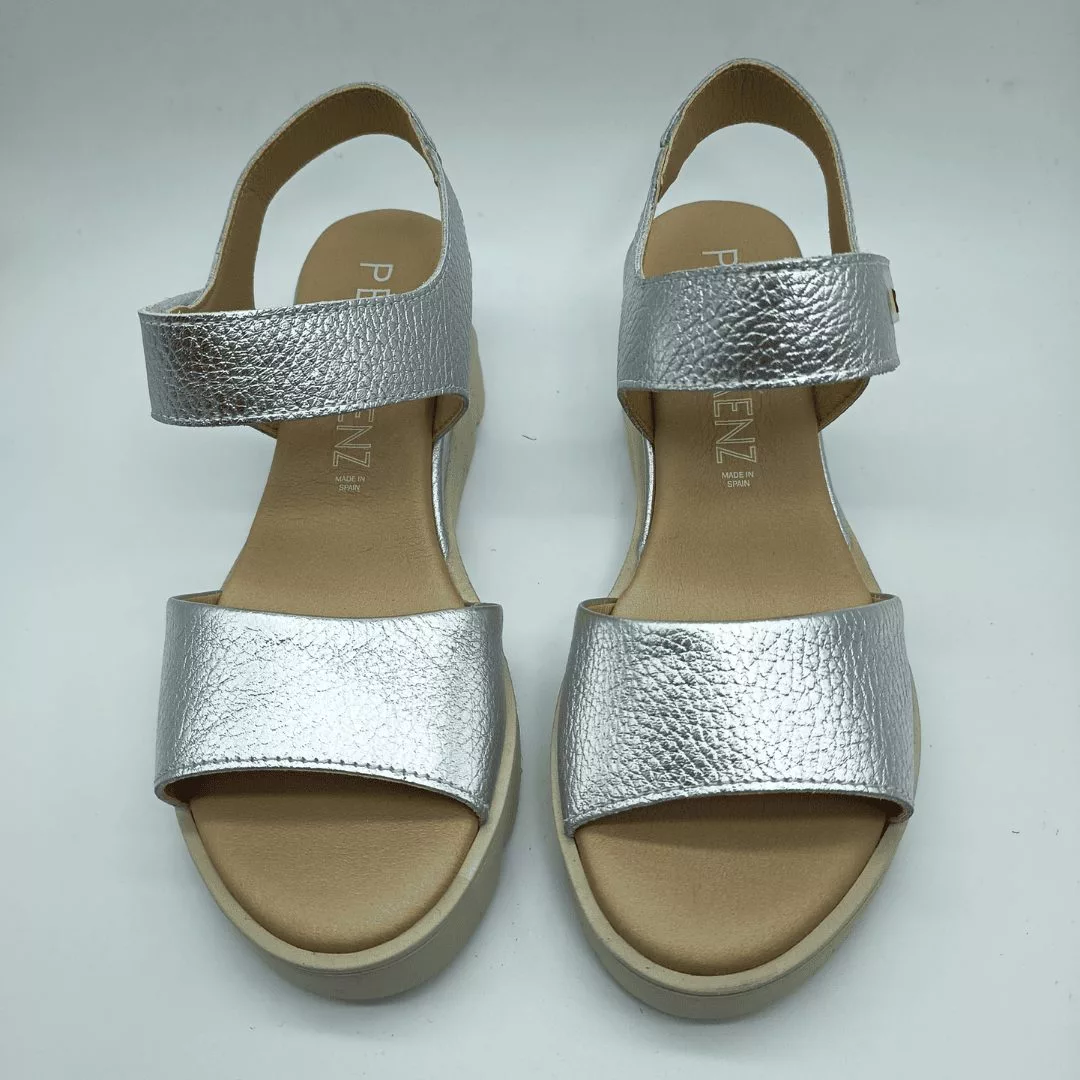 Pepe Sáenz Mod. PS11420, Sandalia en Piel Grabada acabado color Plata, Planta Anatómica. Con Plataforma Bicolor de 5,5 cm en trasera y 2 cm en delantera. Cierre tipo Pulsera mediante Velcro en Tobillo. Suela Dentada. Hecha en España.