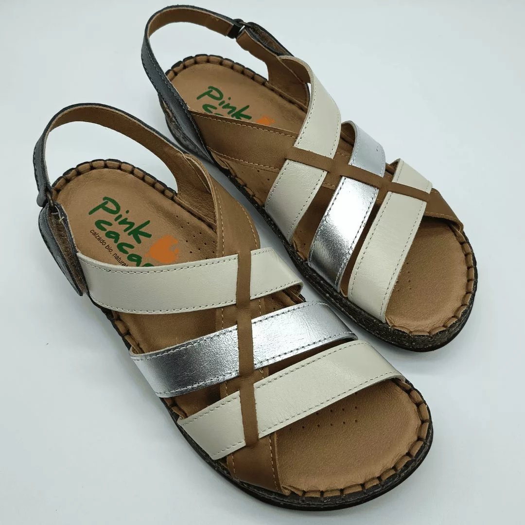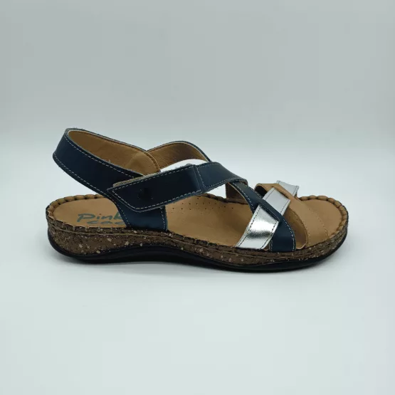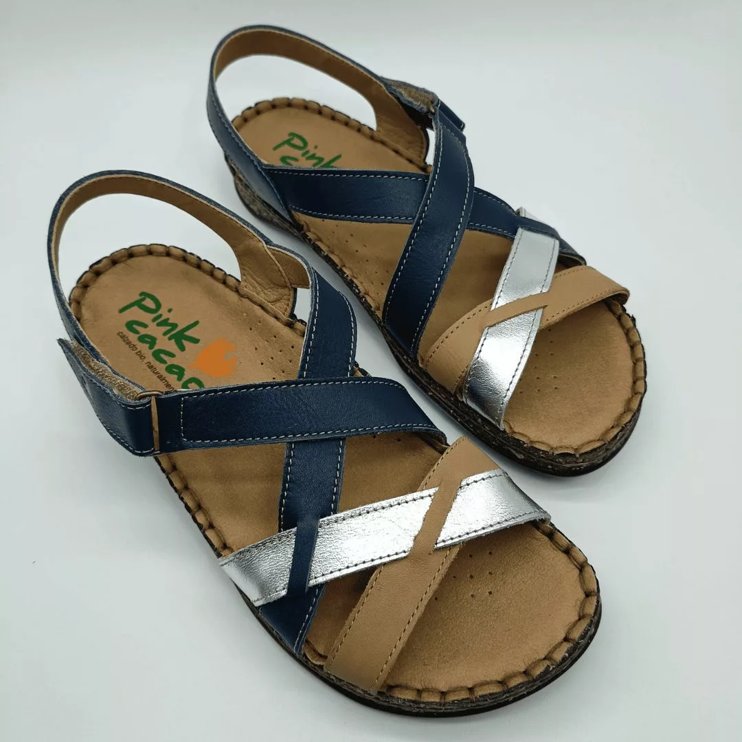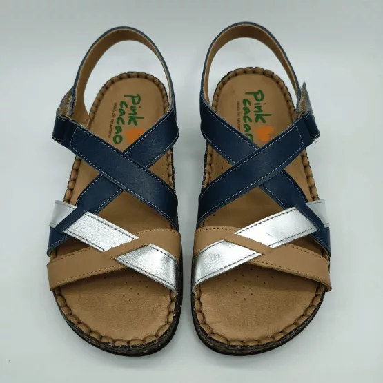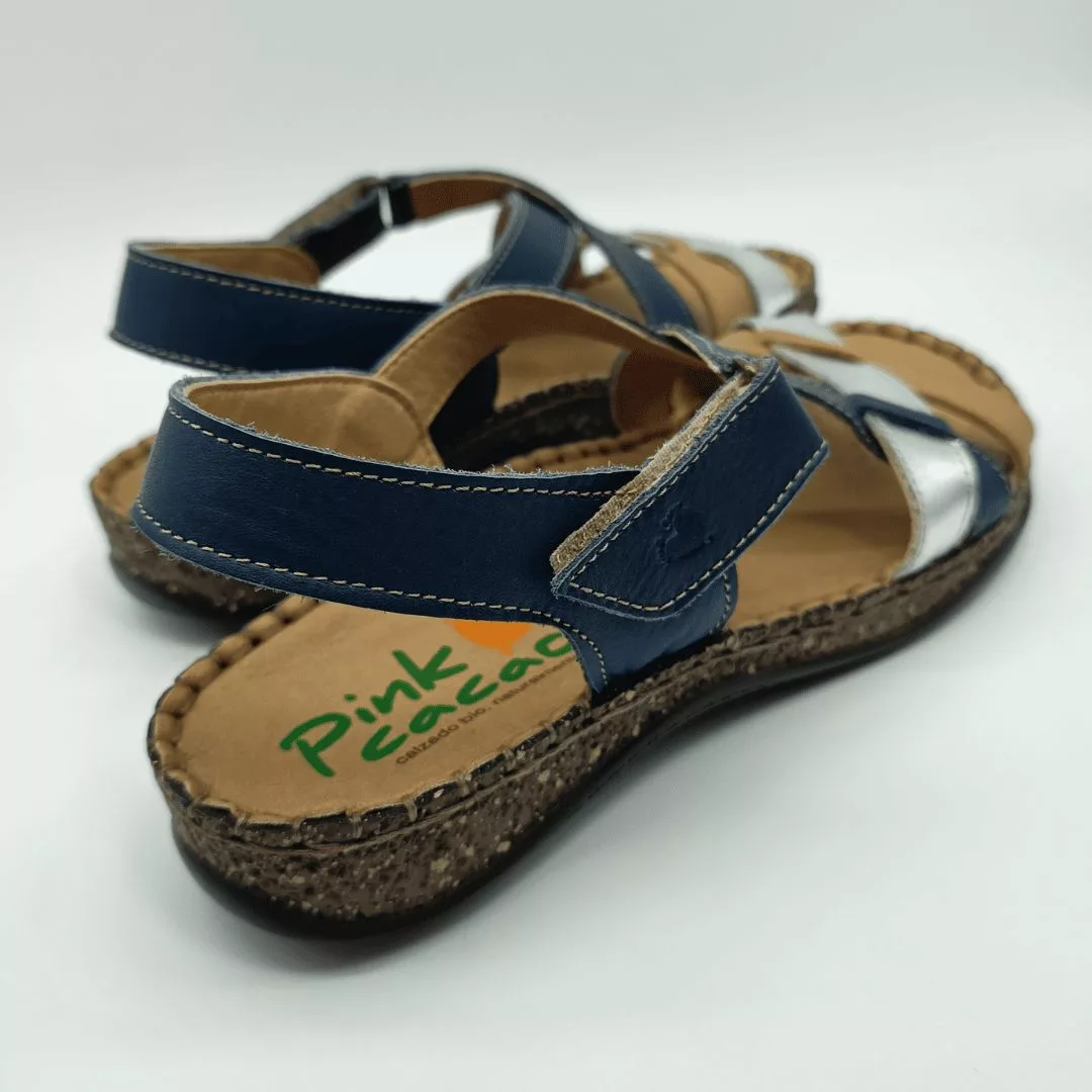 Pink Cacao Mod. PK-76, Sandalia en Piel tipo Bio de Tiras Cruzadas acabado color Azul combinado con Plata y Beige, Plantilla Anatómica, Cuña de 2,5 cm. de altura y cierre mediante Velcro para una mejor sujección.