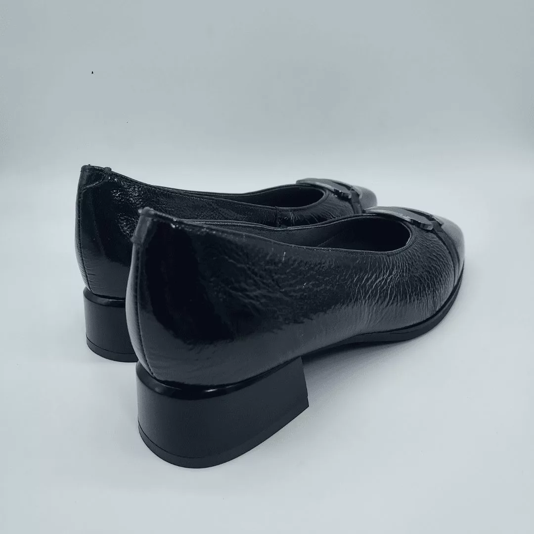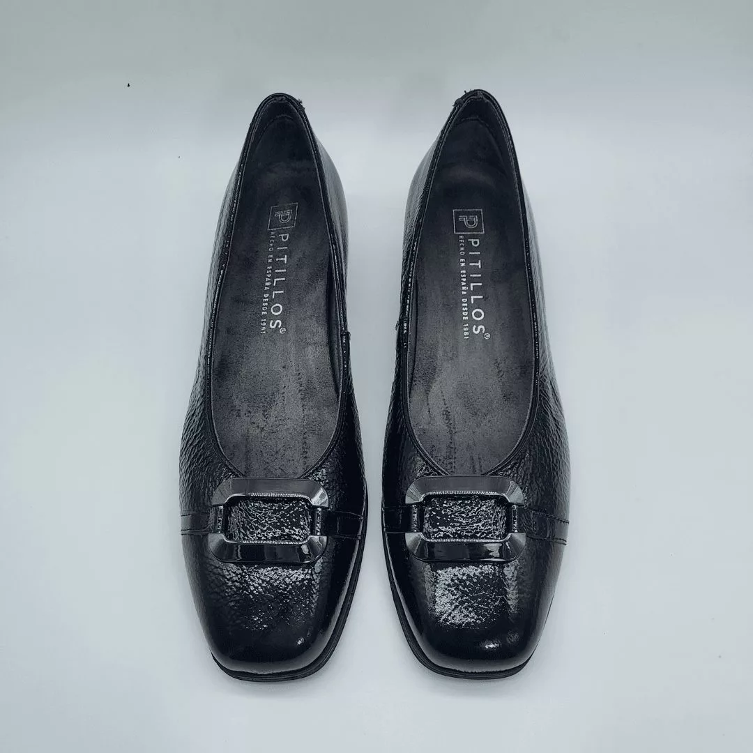 Pitillos Mod. 10812, Salón en Piel Grabada combinada con Lisa, acabado color Negro. Con Adorno Metálico en el Empeine, Tacón Grueso de 3,5 cm, Forro Textil Interior y Plantilla Extraible. Hecho en España.