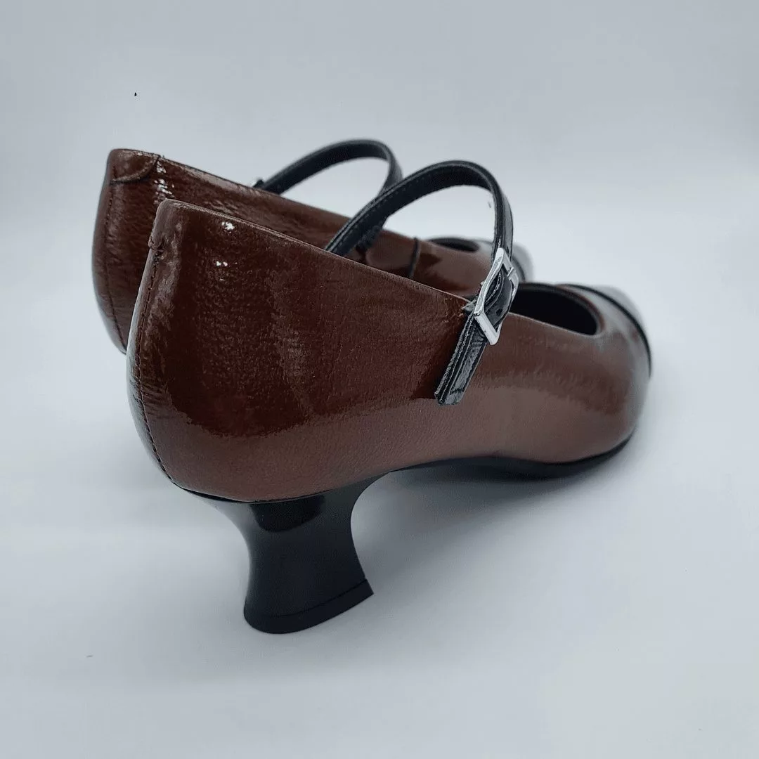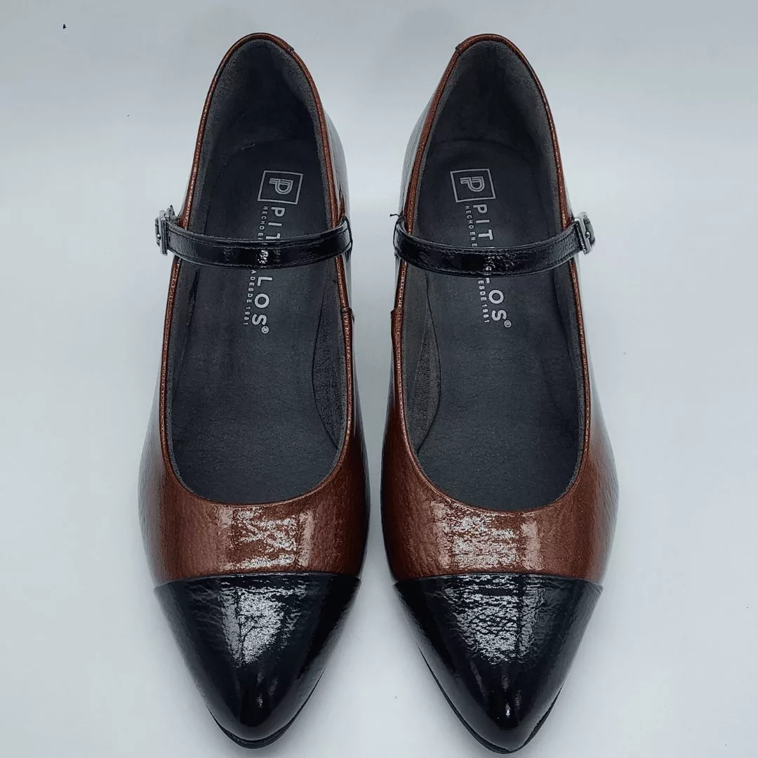 Pitillos Mod. 10851, Salón en Piel Acharolada Grabada color Cuero combinada con Piel Lisa color Negro, cierre mediante Hebilla, con Punta Redondeada, Tacón de 5,5 cm. de altura, con Forro Textil Interior. Hecho en España.
