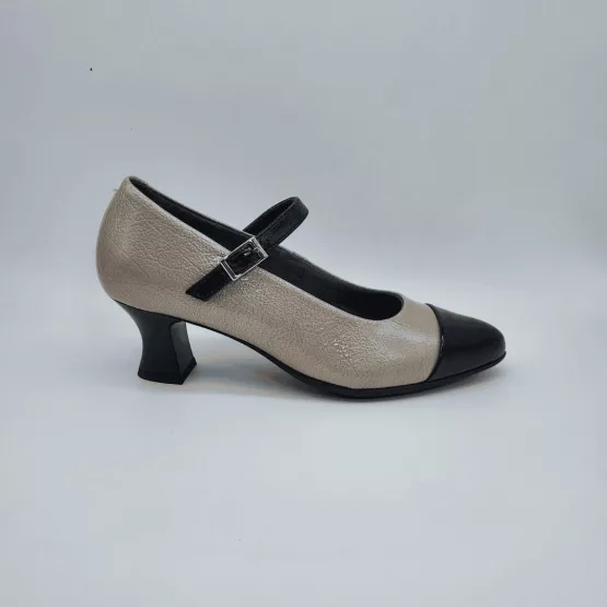pitillos2Pitillos Mod. 10851, Salón en Piel Acharolada Grabada color Piedra combinada con Piel Lisa color Negro, cierre mediante Hebilla, con Punta Redondeada, Tacón de 5,5 cm. de altura, con Forro Textil Interior. Hecho en España.