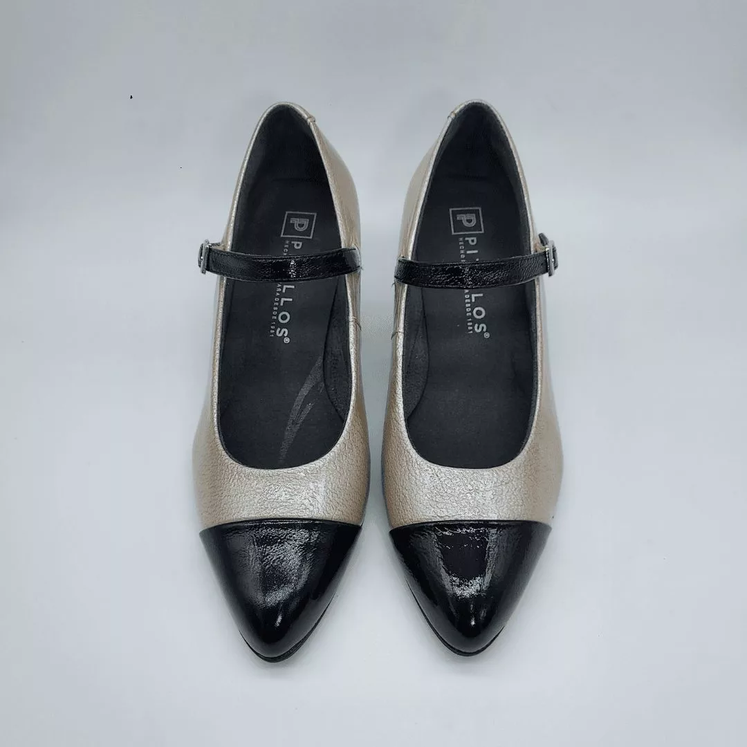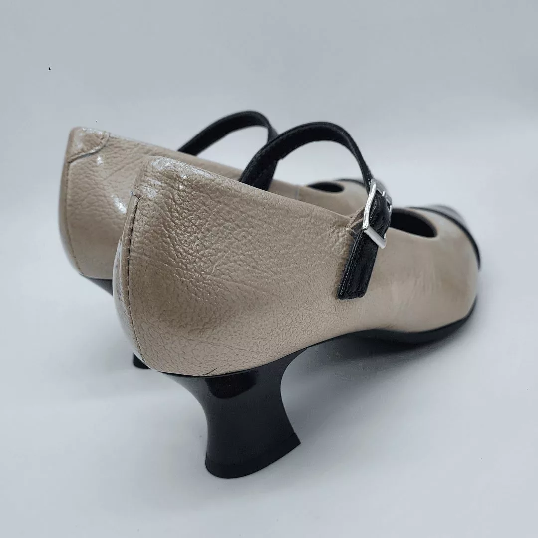 Pitillos Mod. 10851, Salón en Piel Acharolada Grabada color Piedra combinada con Piel Lisa color Negro, cierre mediante Hebilla, con Punta Redondeada, Tacón de 5,5 cm. de altura, con Forro Textil Interior. Hecho en España.