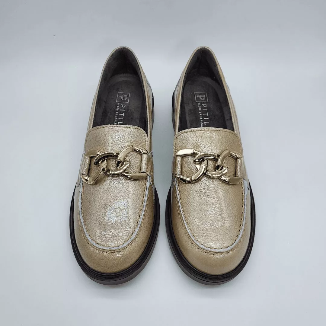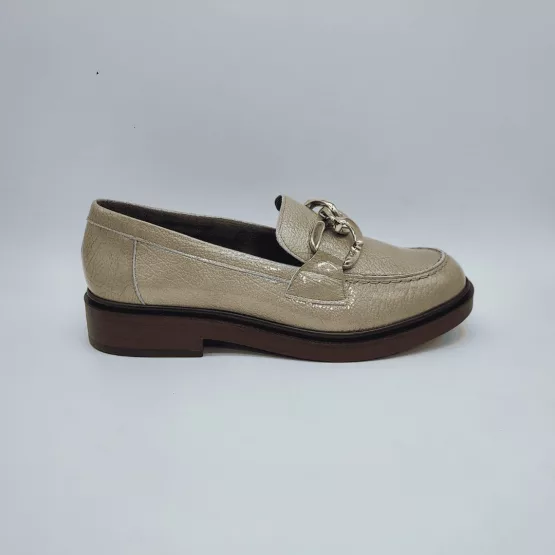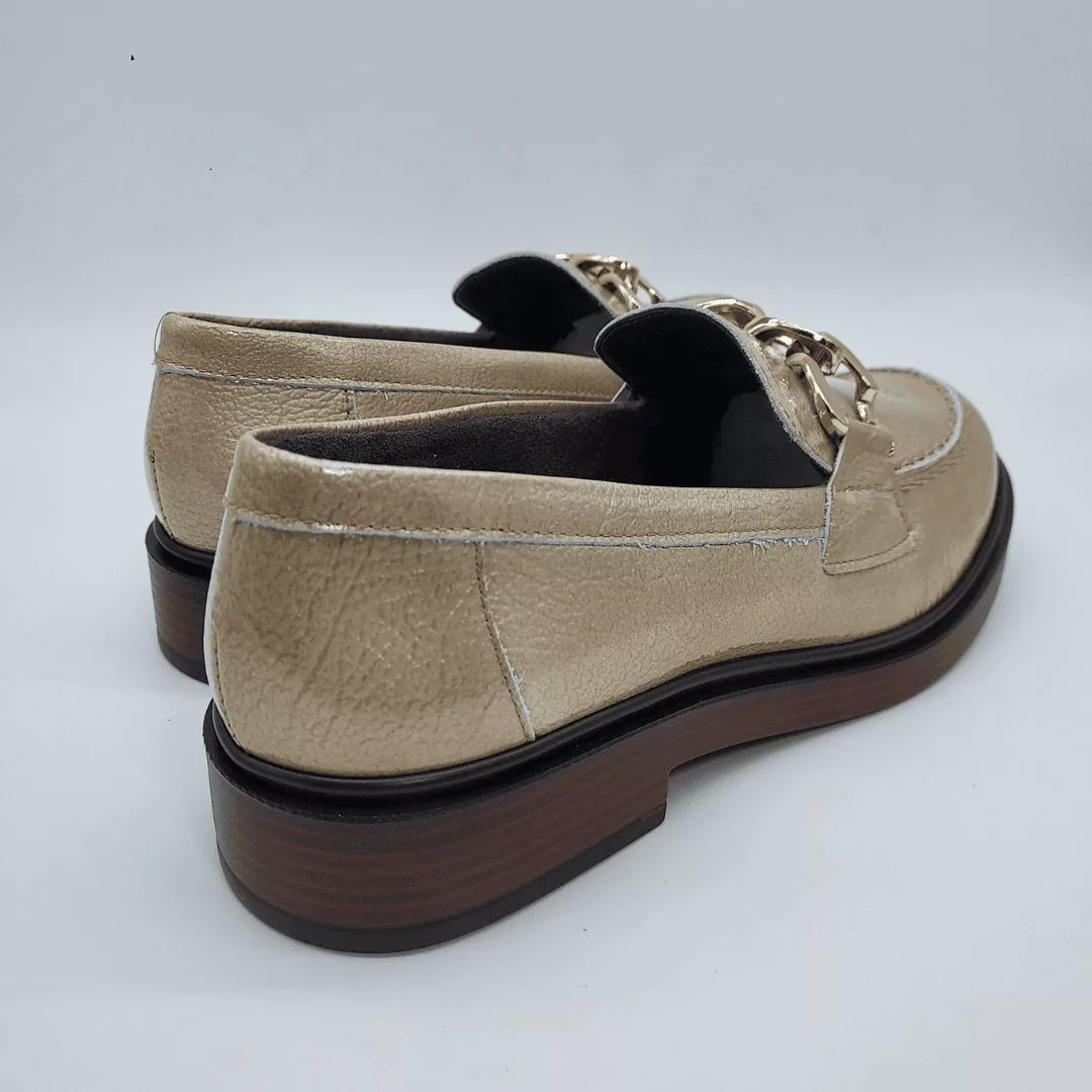 Pitillos Mod. 10890, Mocasín en Piel Acharolada acabado color Piedra, con Adorno Metálico Dorado en el Empeine. Tacón de 3 cm. y Plataforma de 1 cm. de altura, con Forro Textil Interior y Plantilla Extraible. Hecho en España.
