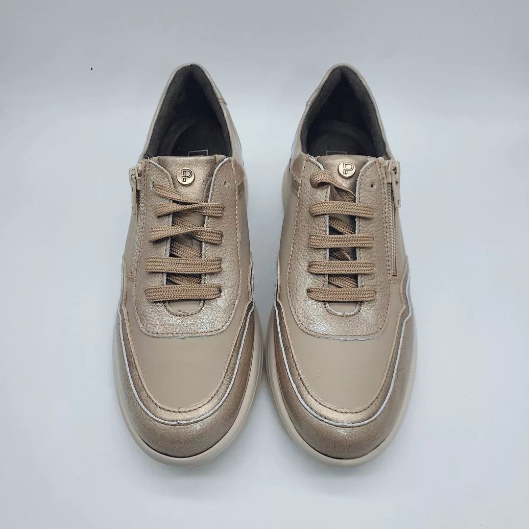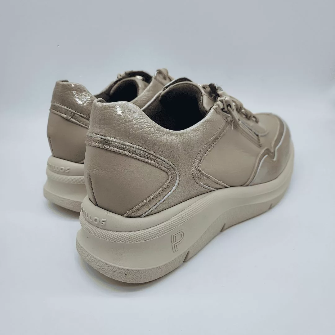 Pitillos Mod. 10910, Deportivo en Piel Acharolada acabado color Piedra. Cierre mediante Cordones Planos, con Cremallera Lateral para facilitar su puesta. Cuña de 3,5 cm. y plataforma de 1 cm., Forro Textil Interior y Plantilla Extraible. Hecho en España.