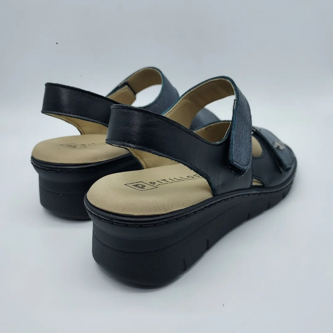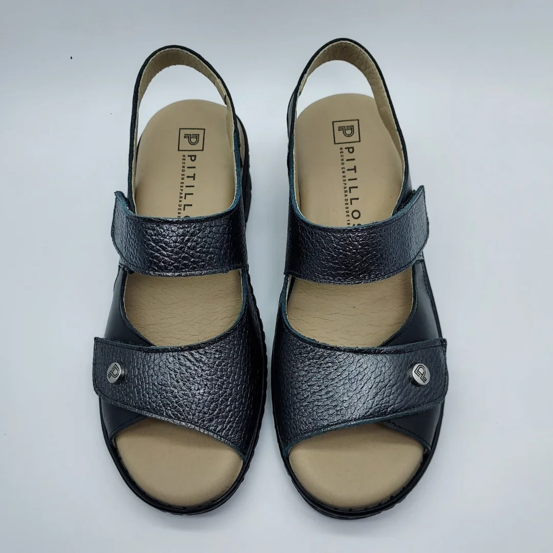 Pitillos Mod. 11010, Sandalia en Piel Grabada combinada con lisa acabado color Negro, Cuña de 3,5 cms. de altura, Cierre mediante dos Velcros en pala con detalle de marca, Plantilla en Textil Acolchada Extraible. Hecha en España.