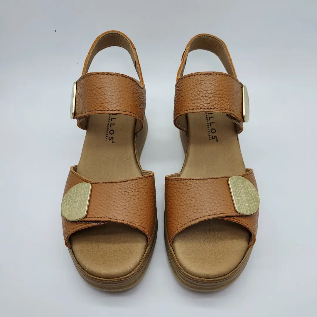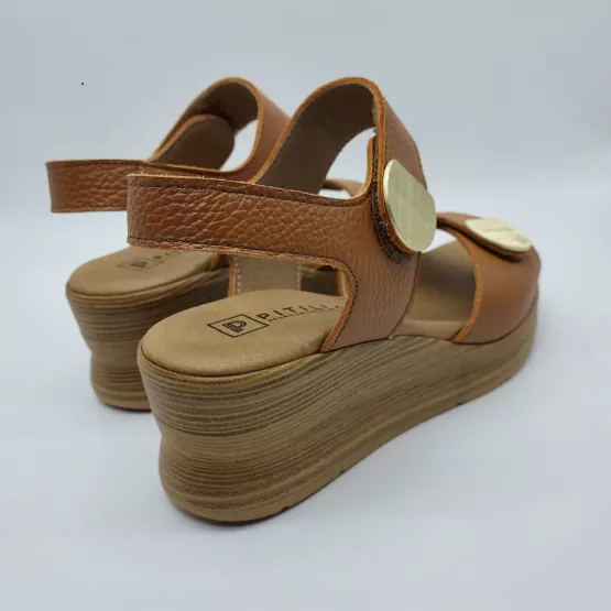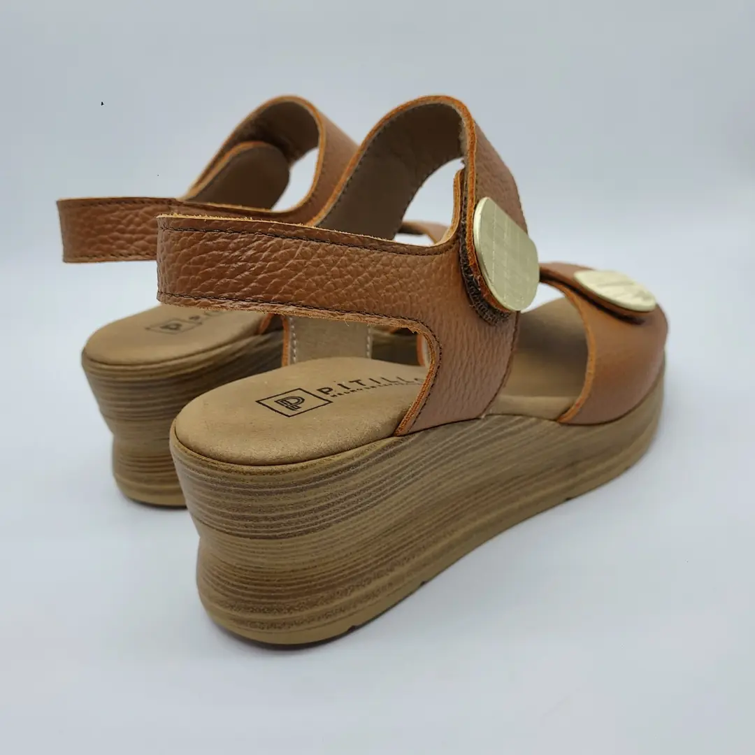 Pitillos Mod. 11054, Sandalia en Piel Grabada Acabado color Cuero, con Cuña de 5,5 cm. de altura y Plataforma de 1,5 cm., Cierre mediante Velcro Ancho (2), con detalles Dorado en tirador, Forro Interior Textil, Plantilla Acolchada y Suela de Goma. Hecha en España.