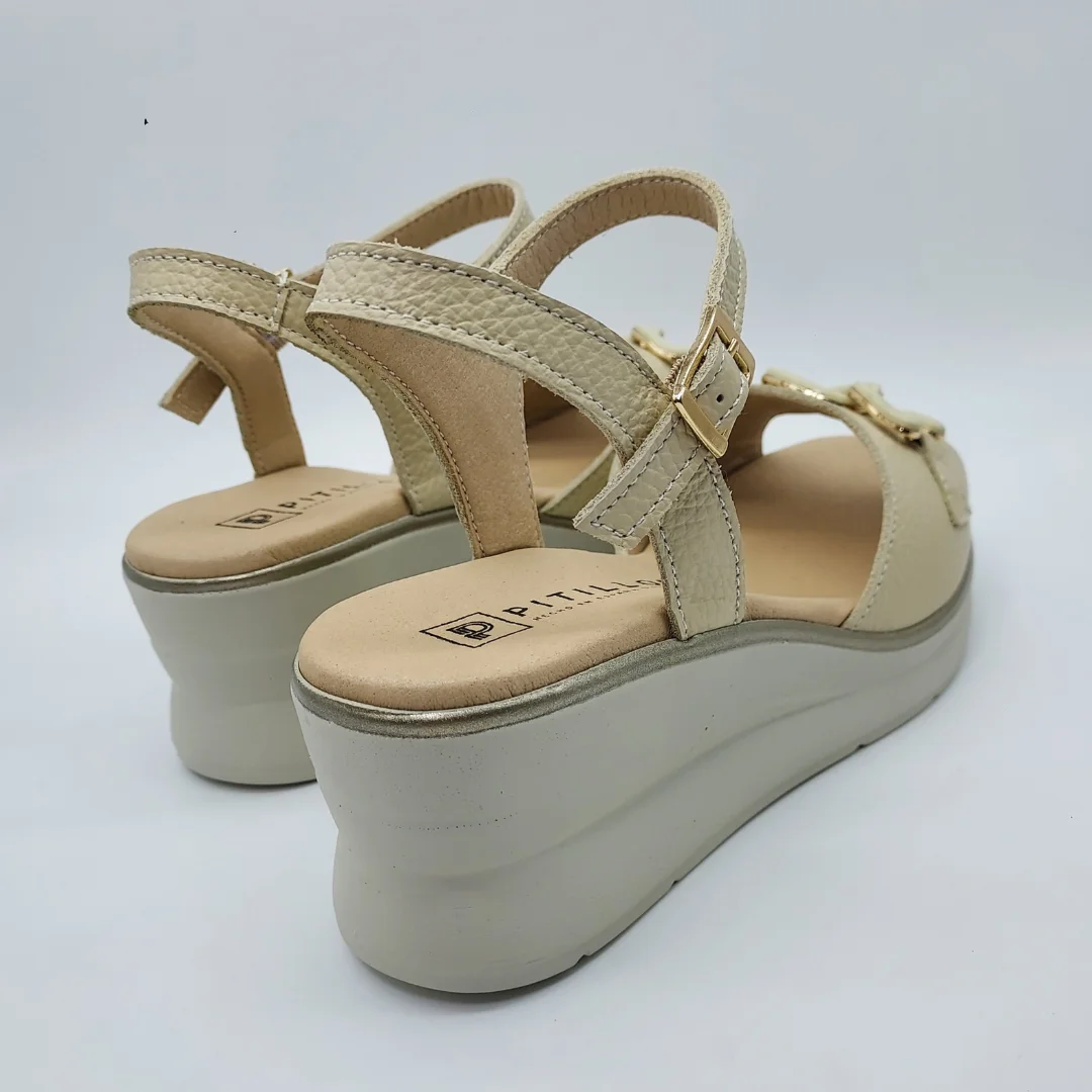 Pitillos Mod. 11062, Sandalia en Piel Grabada Acabado color Crema, con Cuña de 5,5 cm. de altura y Plataforma de 1,5 cm., Cierre mediante Hebilla Ajustable, con detalle de Estribo Metálico en Pala, Forro Interior Textil, Plantilla Acolchada y Suela de Goma. Hecha en España.
