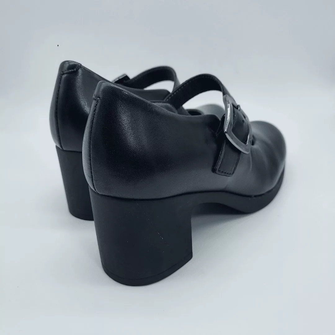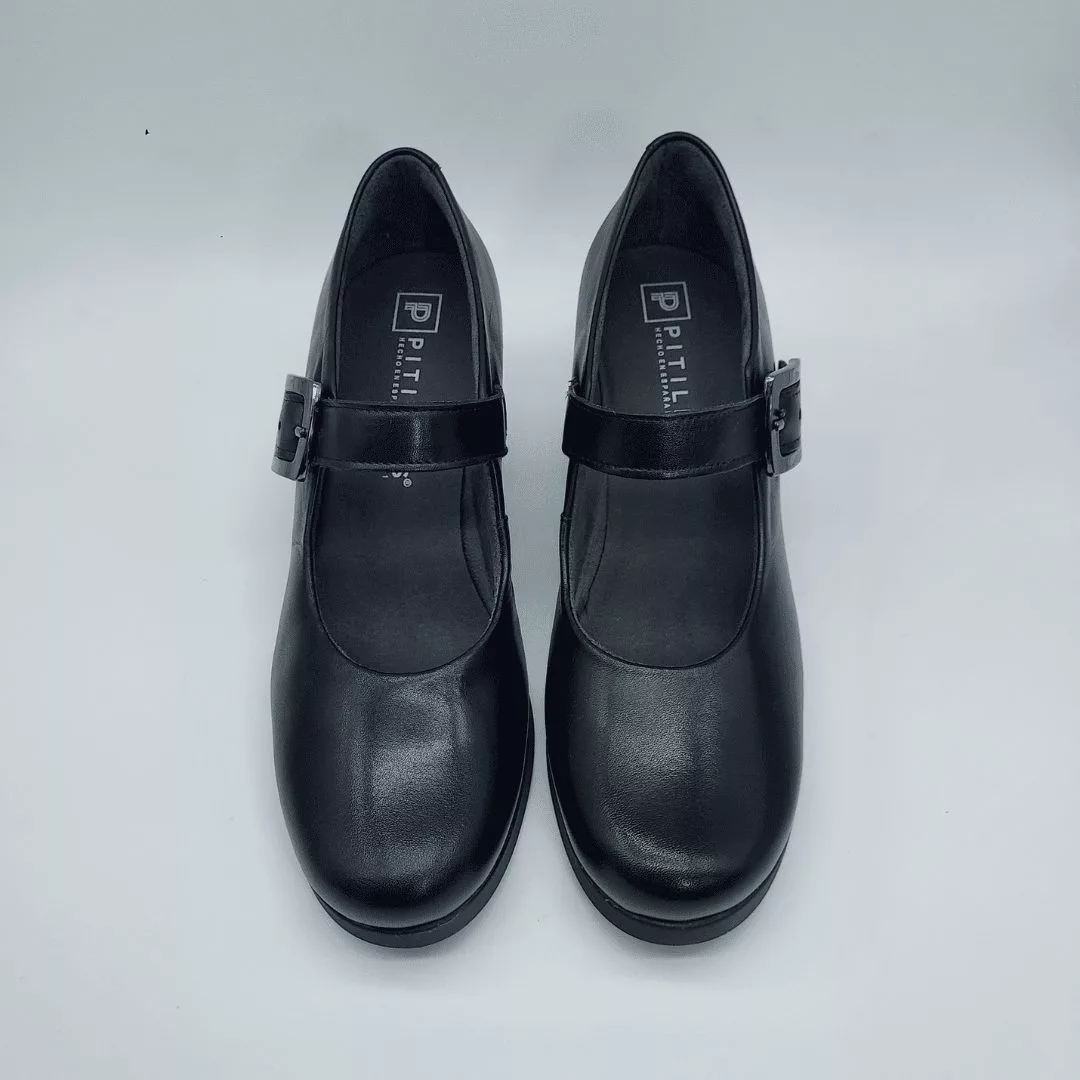 pitillos2Pitillos Mod. 30106, Salón tipo Merceditas en Piel acabado color Negro. Cierre mediante Hebilla Ancha, Tacón Grueso de 5,5 cm. y Plataforma de 1 cm. de altura, con Forro Textil Interior. Hecho en España.