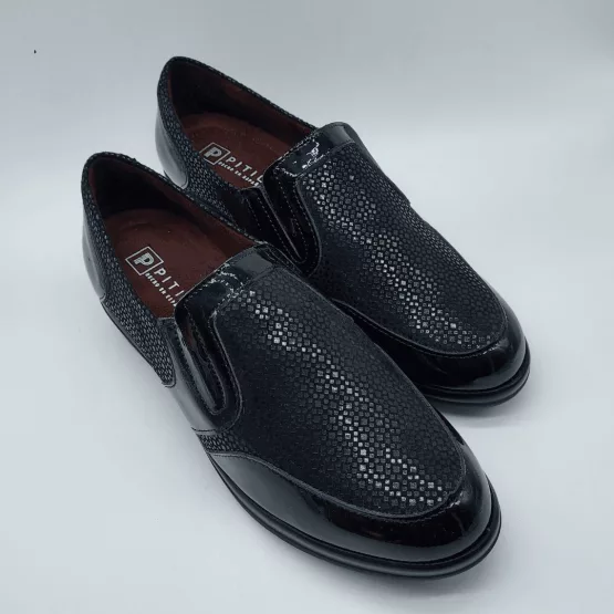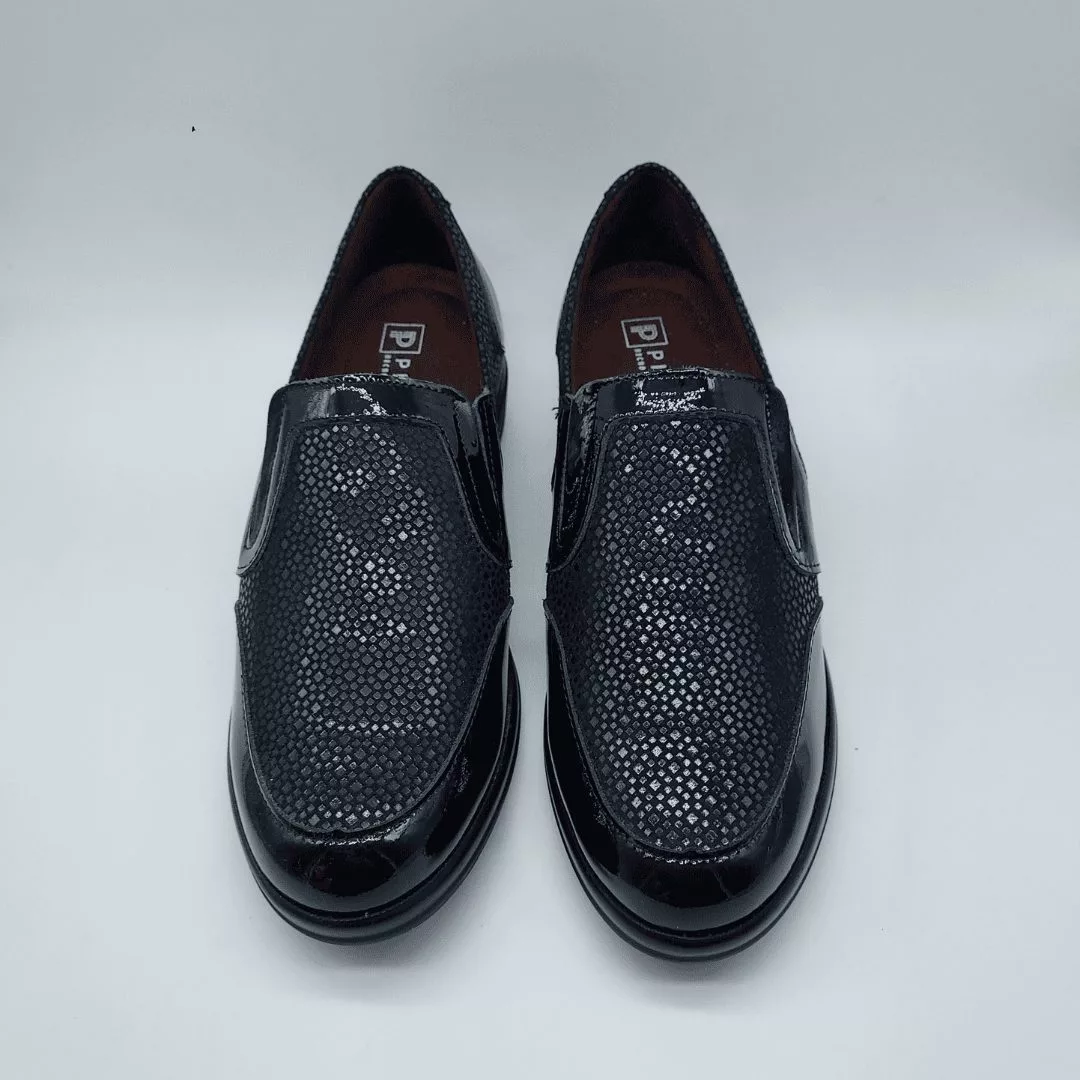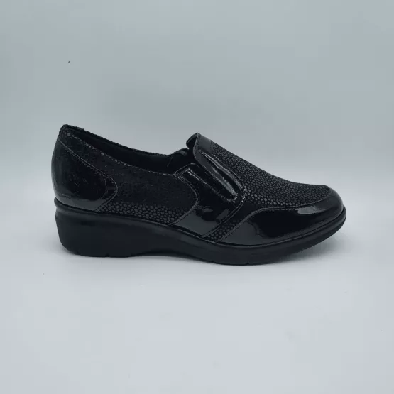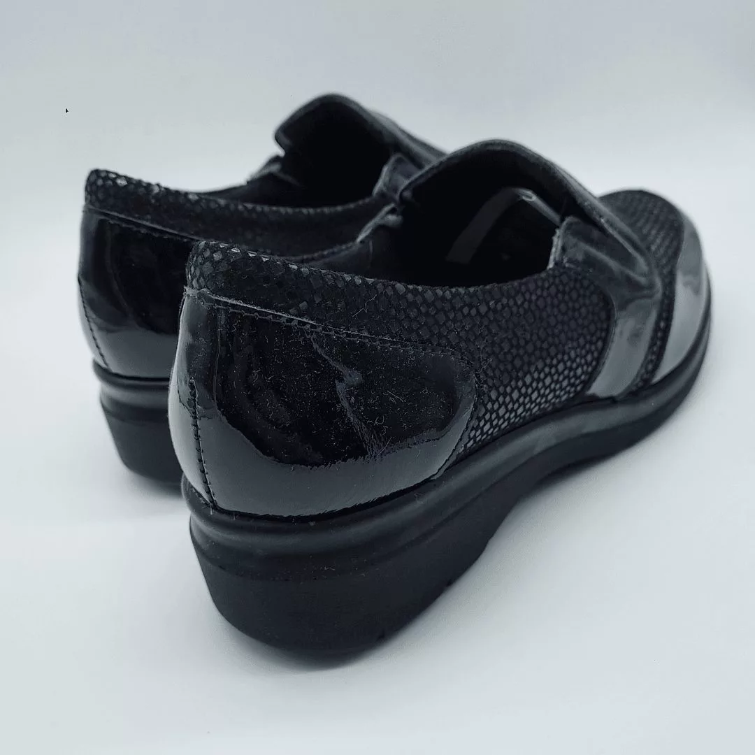 Pitillos Mod. 5310, Confort tipo Manoletina de Cuña en Piel Charol con Lycra, acabado color Negro. Altura de Cuña 4 cm., con Forro Interior Textil Afelpado, Plantilla Extraible Textil Afelpada. Suela Poliuretano. Hecho en España.