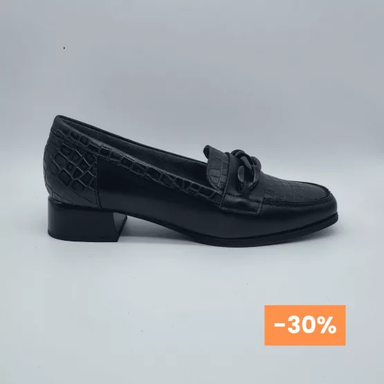 Pitillos Mod. 5421, Mocasín en Piel Grabada en Coco combinada con Piel Lisa acabado color Negro. Adorno de Cadena en Parte Delantera, Suela de Goma Antideslizante, Tacón Grueso de 3 cm., Forro Textil Interior y Plantilla Extraible. Hecho en España.