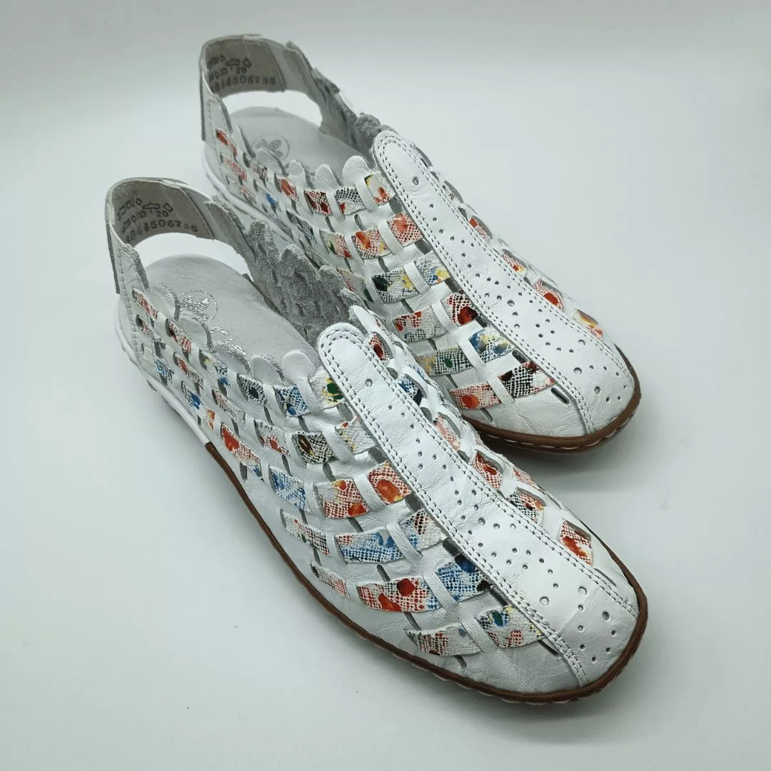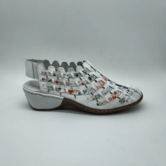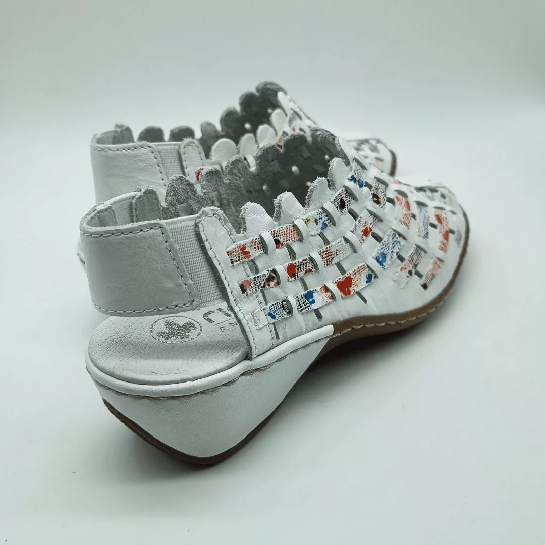 Rieker Mod. 47156-81, Sandalia con Puntera Cerrada en Piel Trenzada acabado Blanco con diferentes tonalidades, con Cuña de 4 cm., Plantilla Antistress, Suela de Goma Flexible. Envío, Devolución y Reembolso