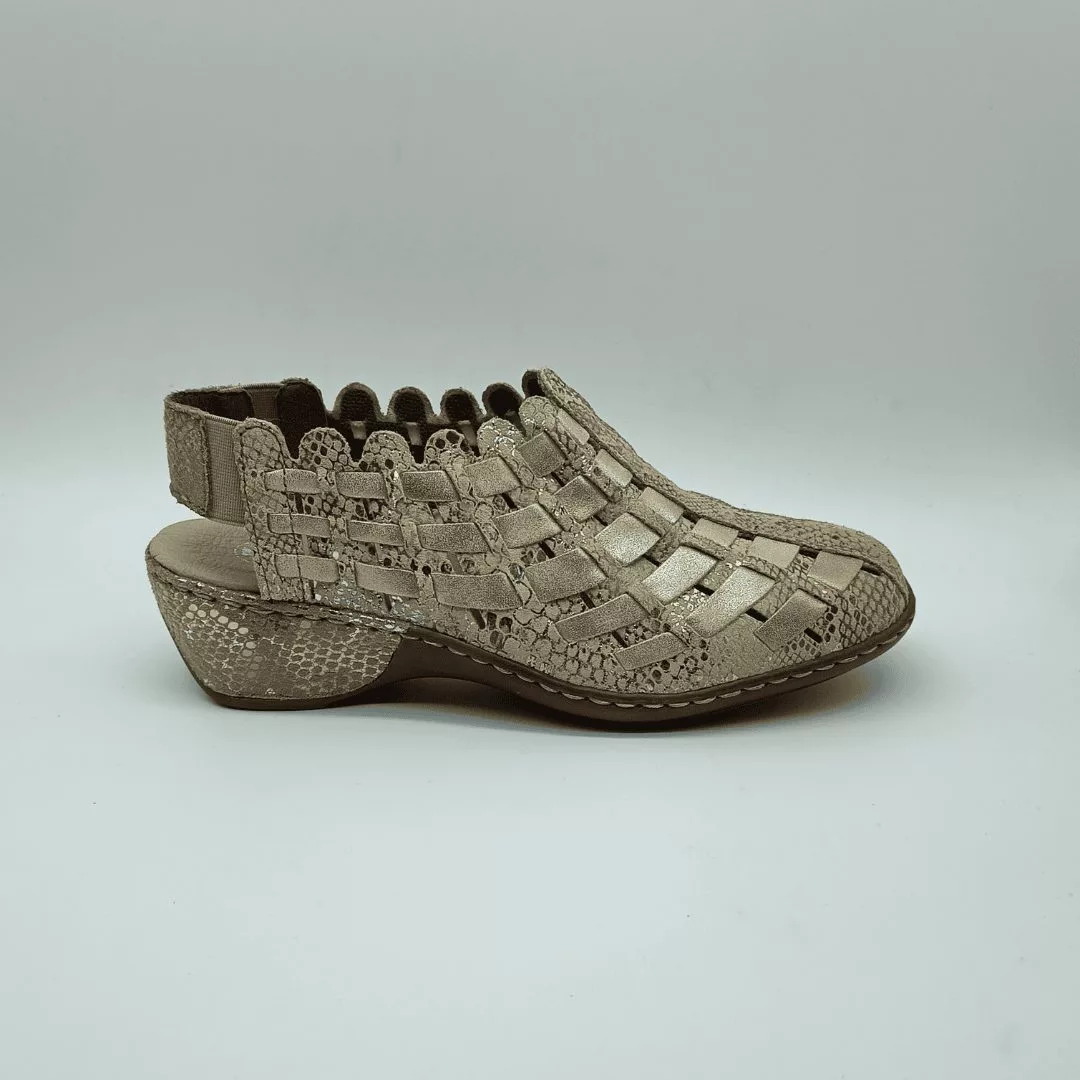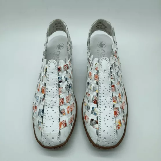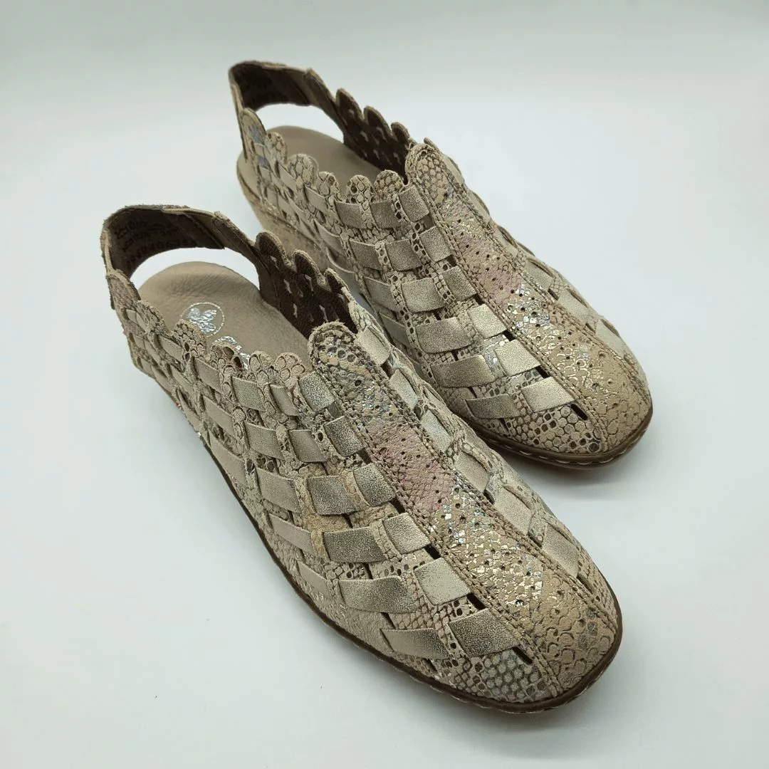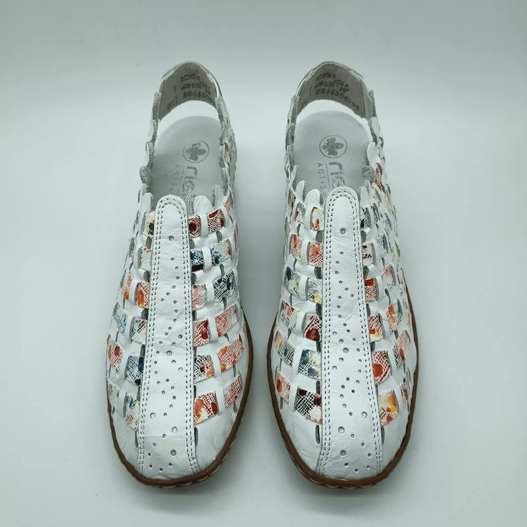 Rieker Mod. 47156-81, Sandalia con Puntera Cerrada en Piel Trenzada acabado Blanco con diferentes tonalidades, con Cuña de 4 cm., Plantilla Antistress, Suela de Goma Flexible. Envío, Devolución y Reembolso