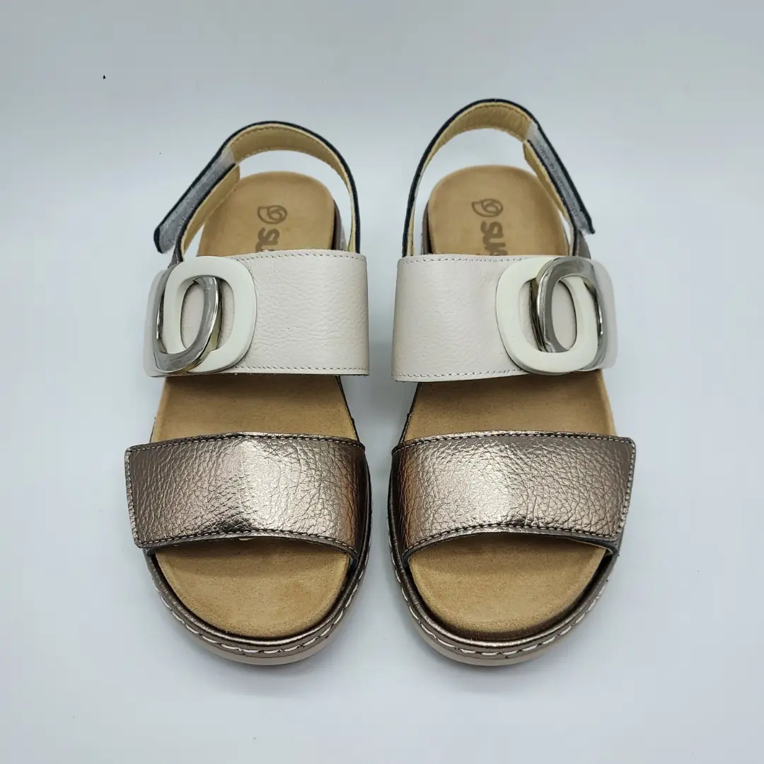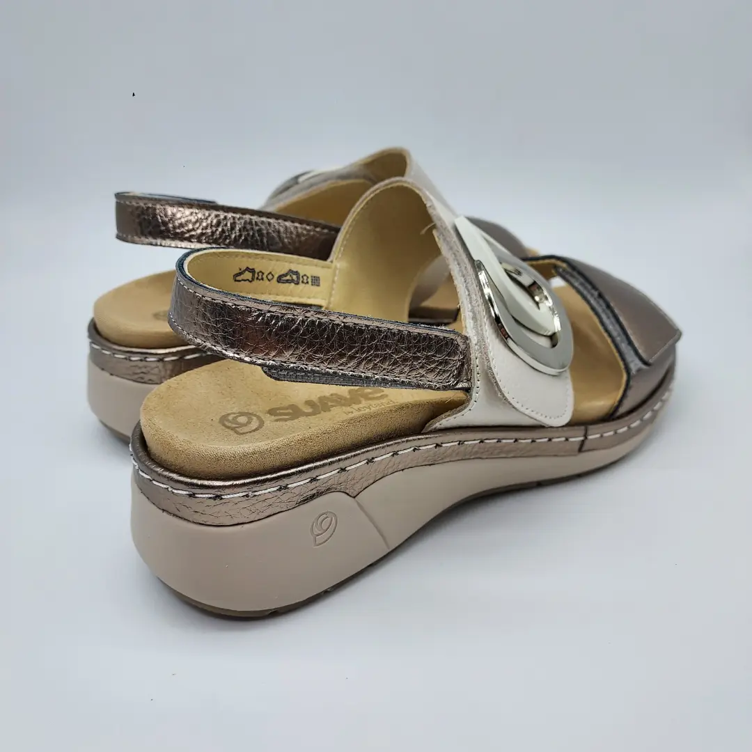 Suave Mod. 3323, Sandalia en Piel acabado color Hielo combinada con Metalizada, Detalle de Hebilla Figurada, Cuña Baja de 3,5 cm., Plantilla Acolchada Extraible en Piel. Con Cierre mediante Velcro (3).