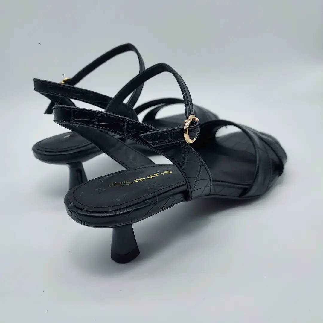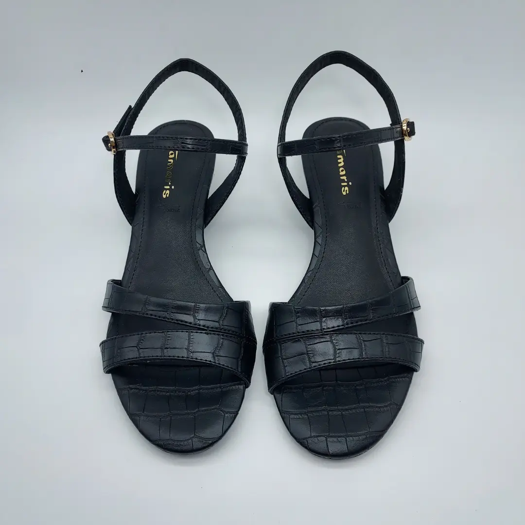 Tamaris Mod. 1-28314-46, Sandalia Grabada fabricada en materiales Sintéticos, acabado Black Coco, Plantilla Acolchada en Piel Touch-it, Altura Tacón tipo chupete 4,5 cm. Cierre mediante Hebilla en Tobillo. Suela Antideslizante.