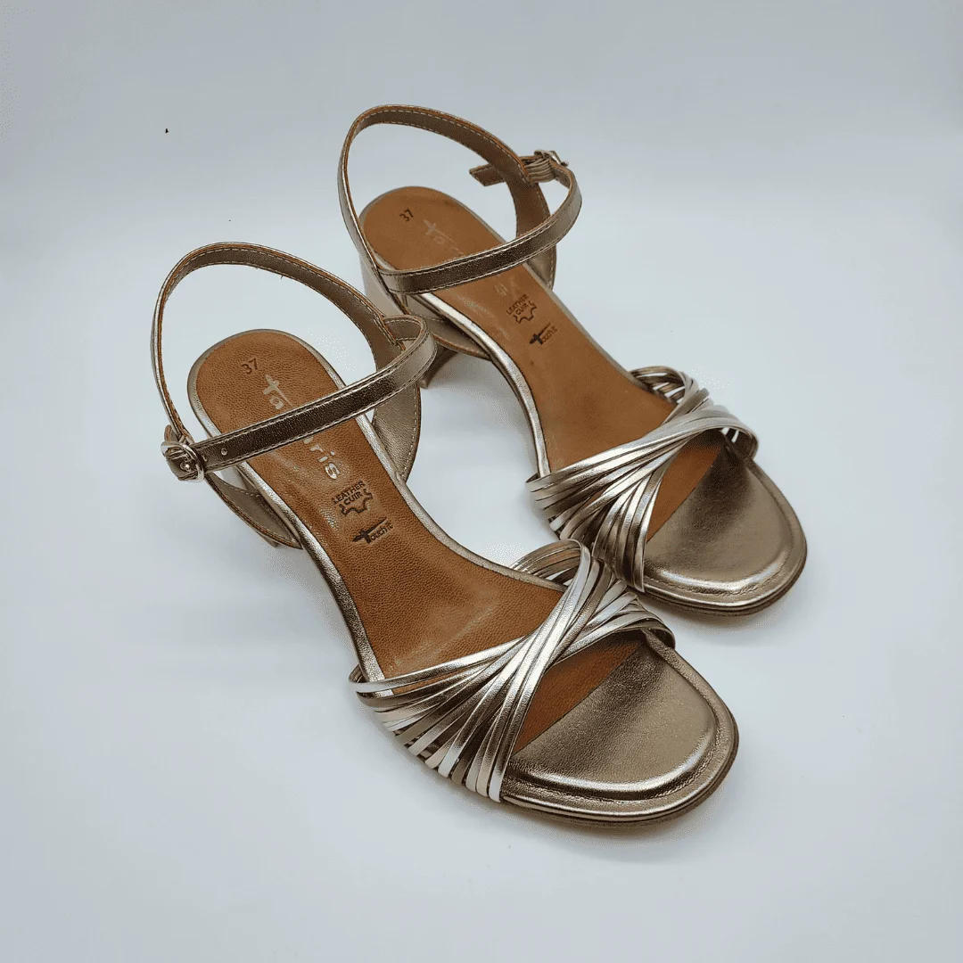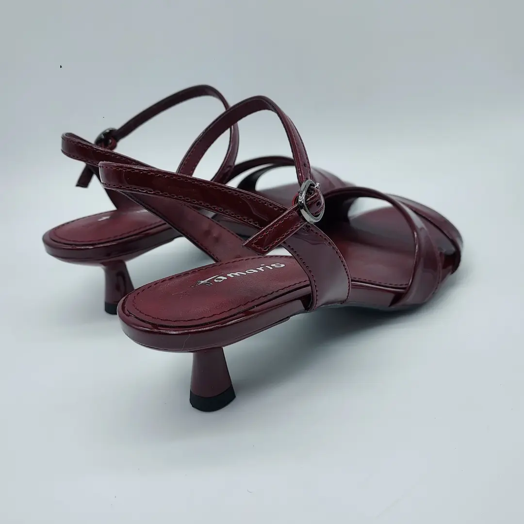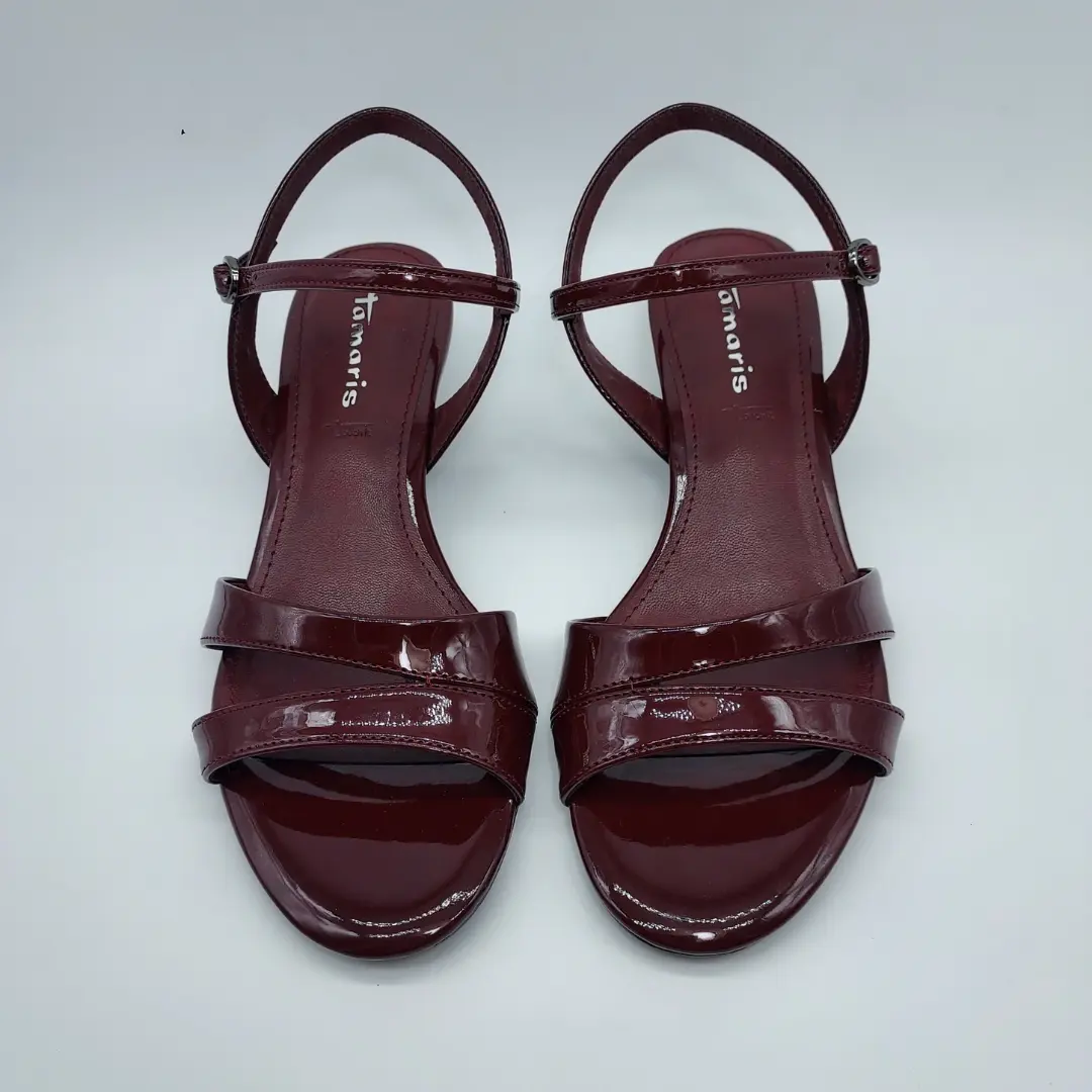 Tamaris Mod. 1-28314-46, Sandalia Acharolada fabricada en materiales Sintéticos, acabado Merlot, Plantilla Acolchada en Piel Touch-it, Altura Tacón tipo chupete 4,5 cm. Cierre mediante Hebilla en Tobillo. Suela Antideslizante.