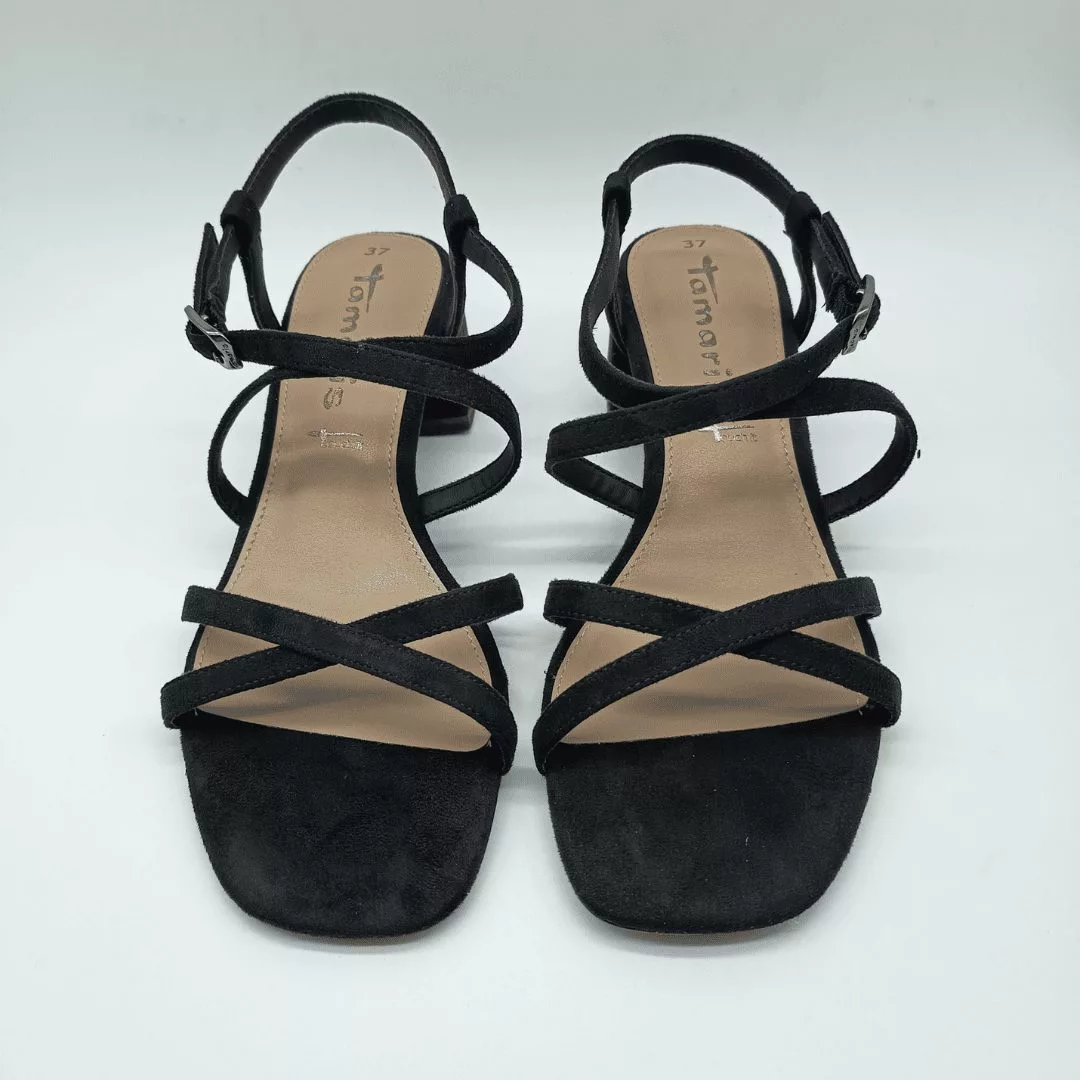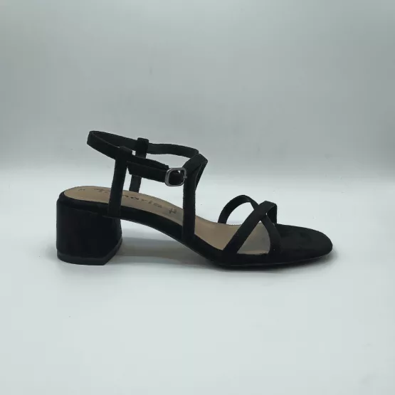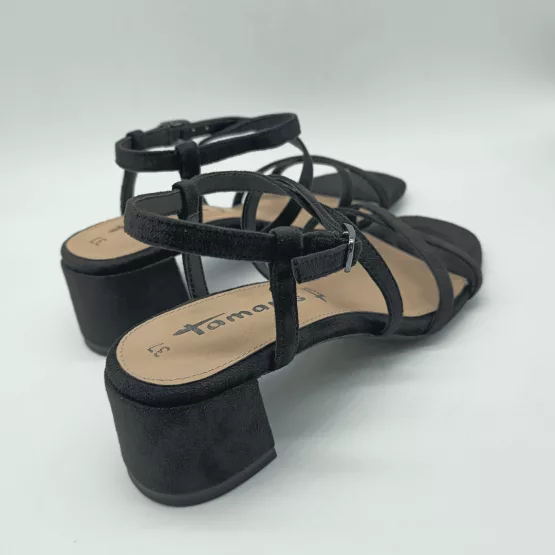 Tamaris Mod. 28204-42, Sandalia fabricada en materiales Textiles combinados con Sintéticos, acabado Black, Plantilla Acolchada, con Tiras Finas Cruzadas en Pala, Altura Tacón 5,5 cm. Cierre mediante Hebilla en Tobillo.