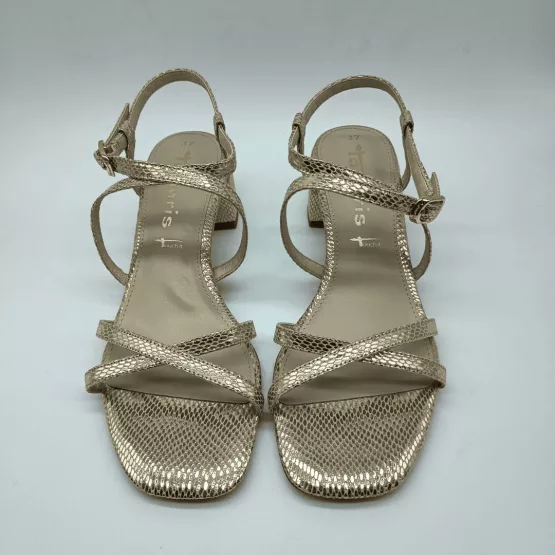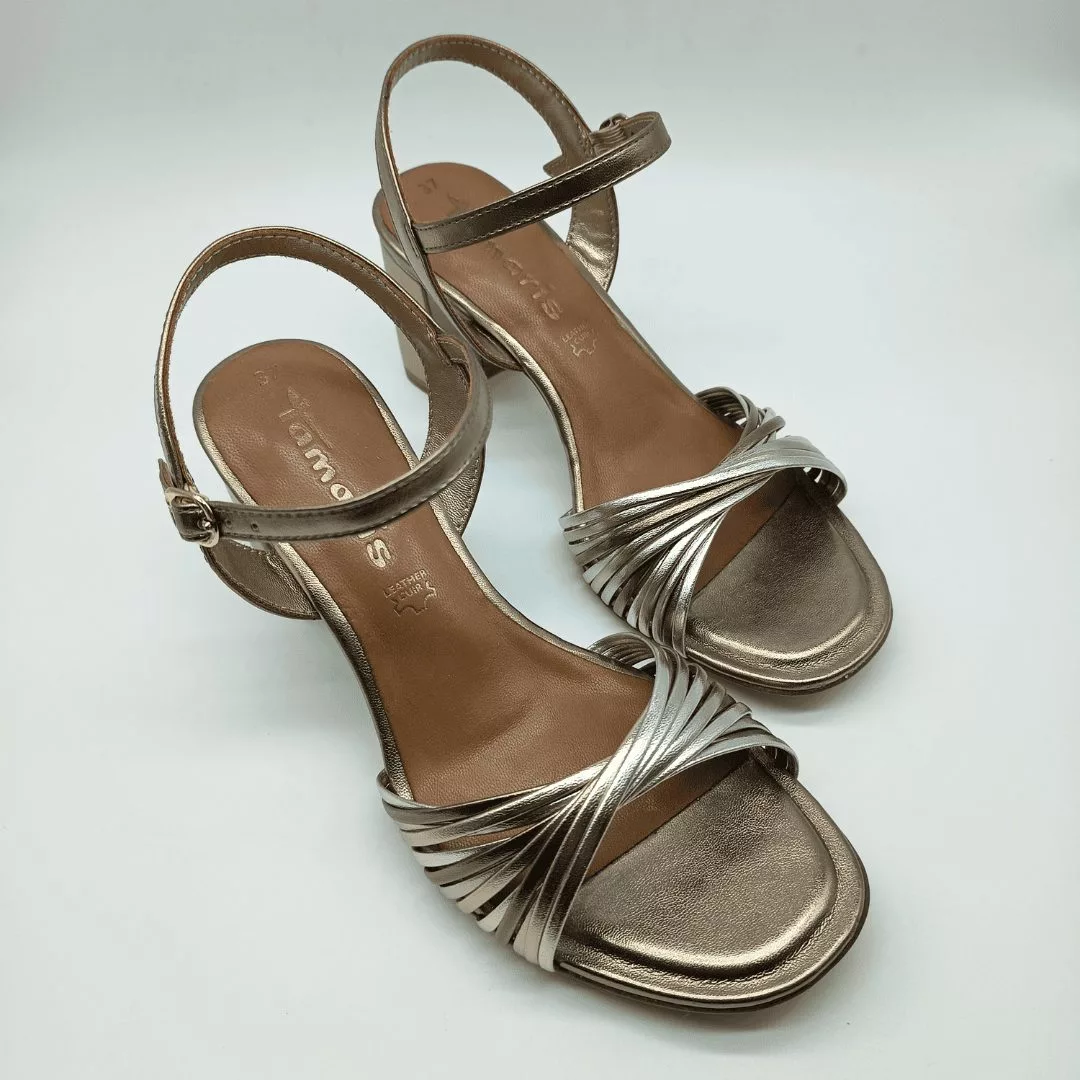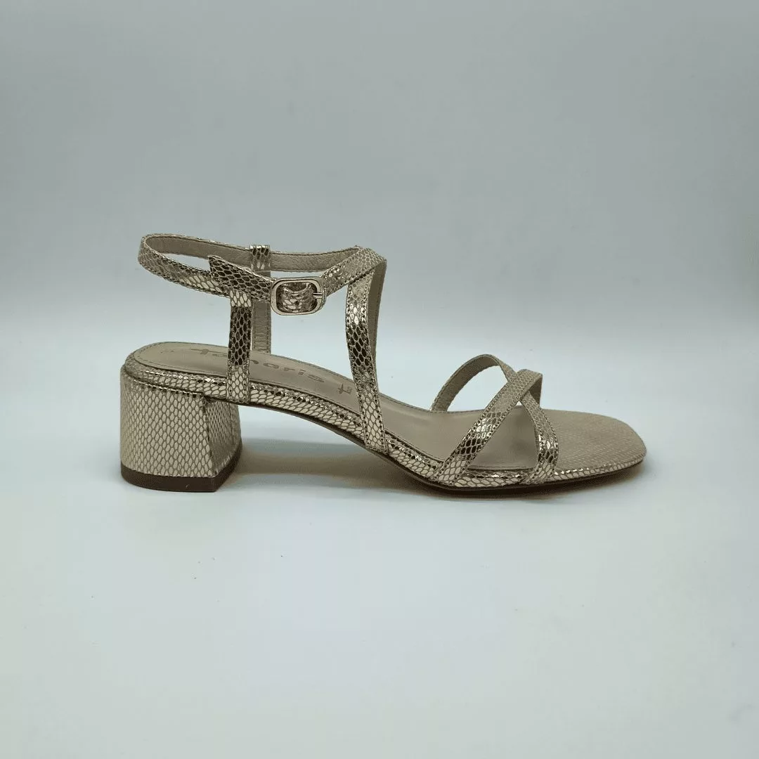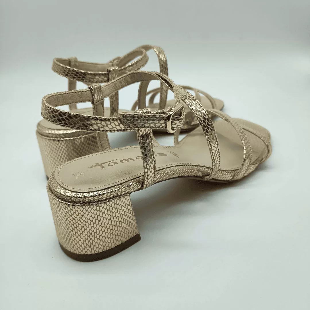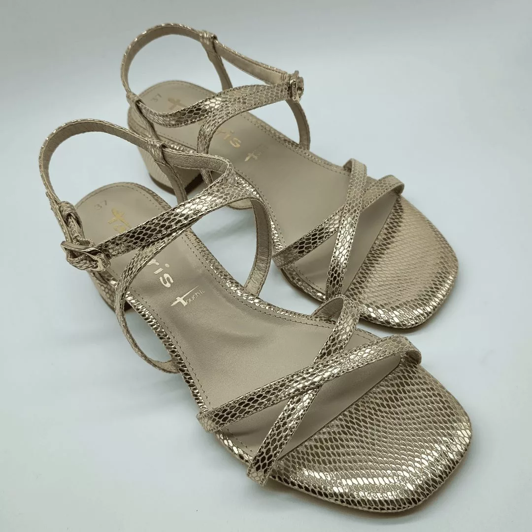 Tamaris Mod. 28204-42, Sandalia fabricada en materiales Textiles combinados con Sintéticos, acabado Gold, Plantilla Acolchada, con Tiras Finas Cruzadas en Pala, Altura Tacón 5,5 cm. Cierre mediante Hebilla en Tobillo.