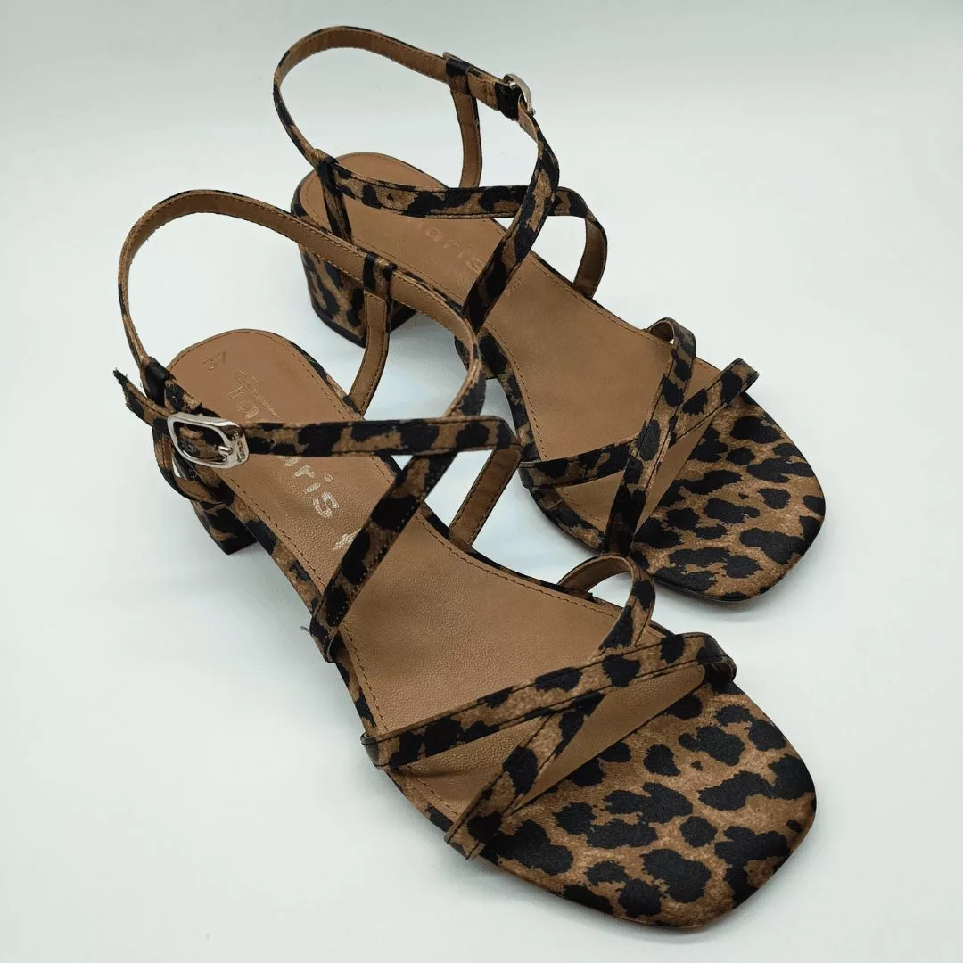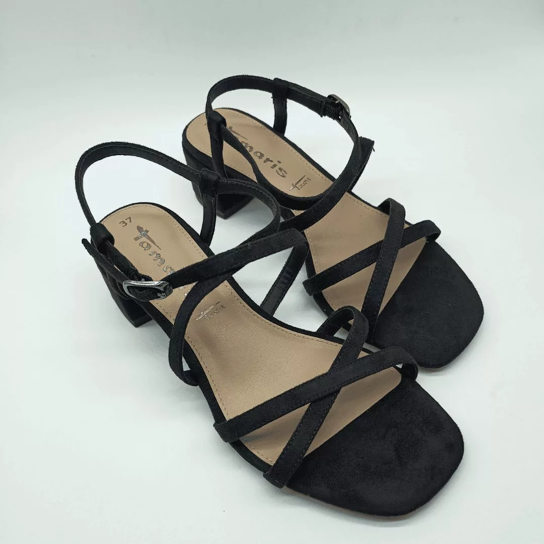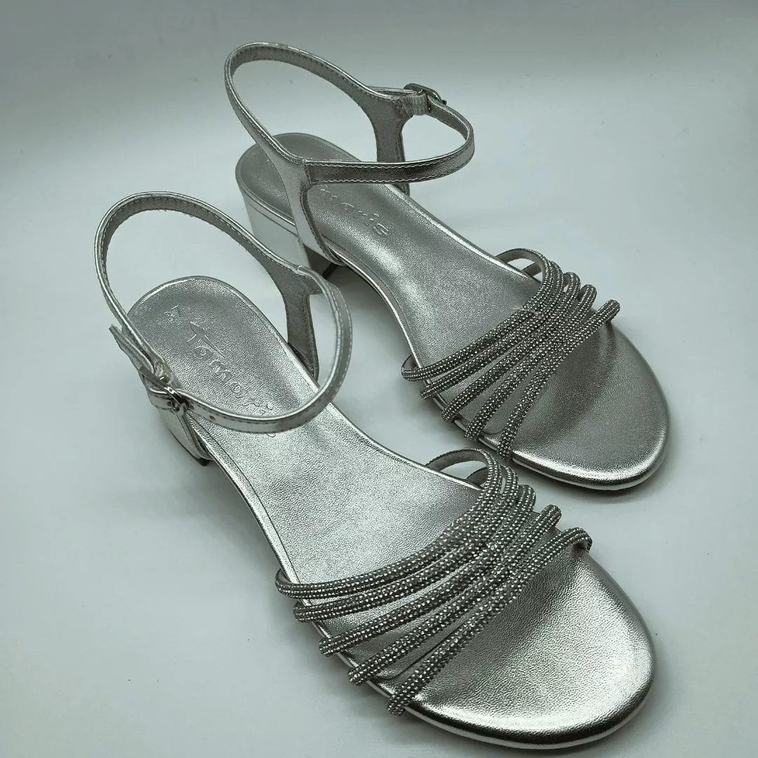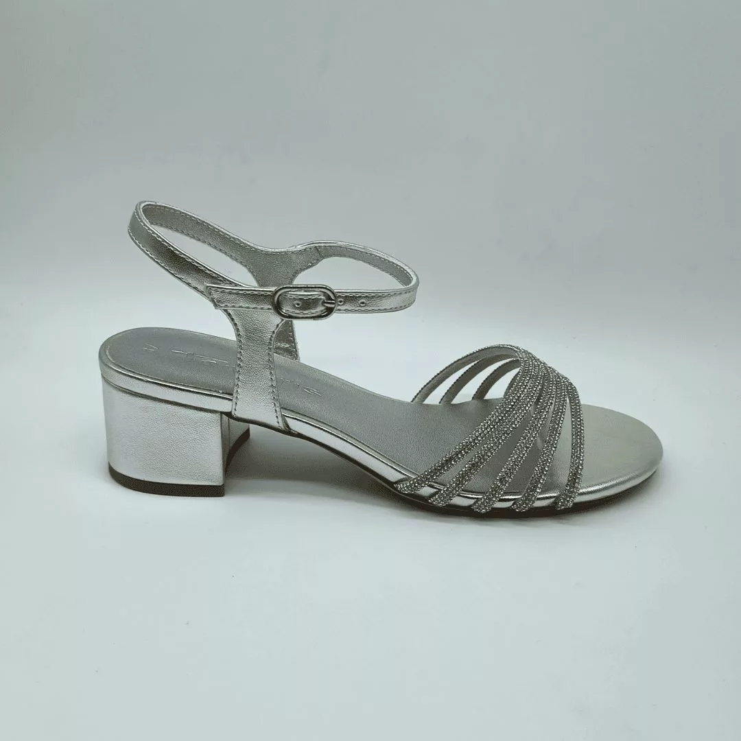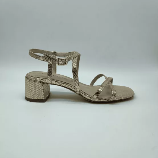 Tamaris Mod. 28204-42, Sandalia fabricada en materiales Textiles combinados con Sintéticos, acabado Gold, Plantilla Acolchada, con Tiras Finas Cruzadas en Pala, Altura Tacón 5,5 cm. Cierre mediante Hebilla en Tobillo.