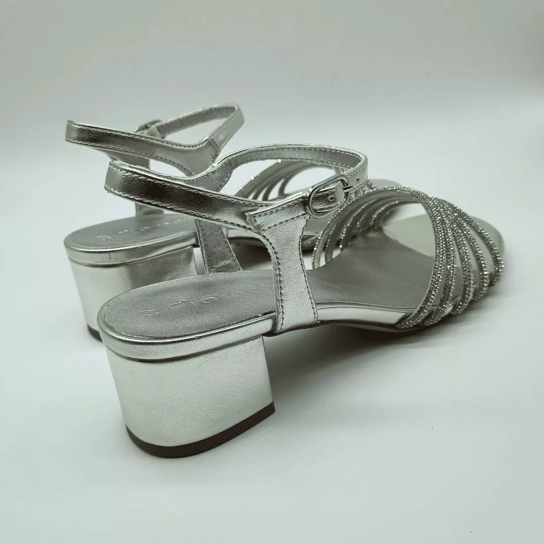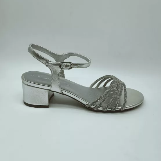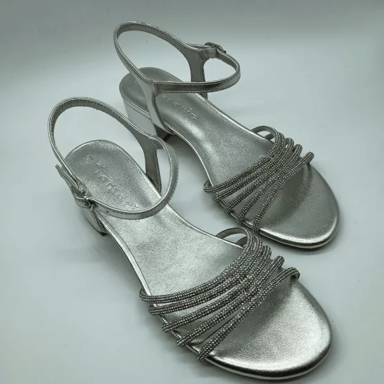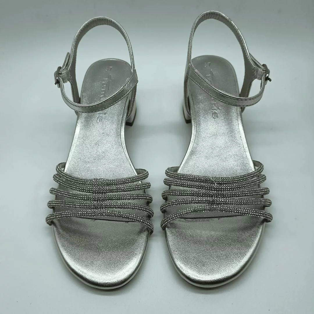 Tamaris Mod. 28248-44, Sandalia fabricada en materiales Textiles combinados con Sintéticos, acabado Platinum, Plantilla Acolchada, Tiras Finas con Adorno tipo Swarovski en Pala, Altura Tacón 4,5 cm. Cierre mediante Hebilla en Tobillo.
