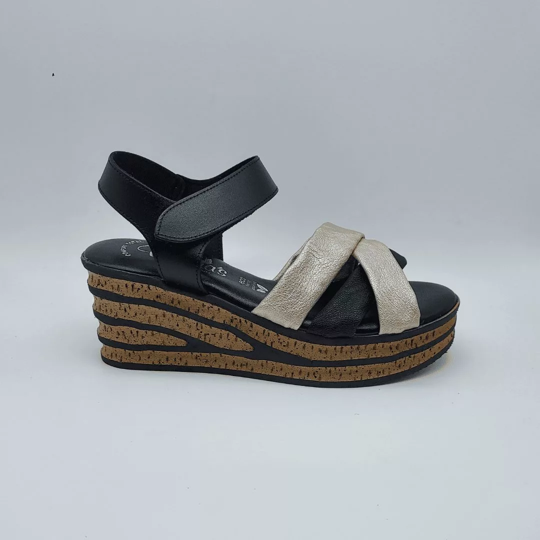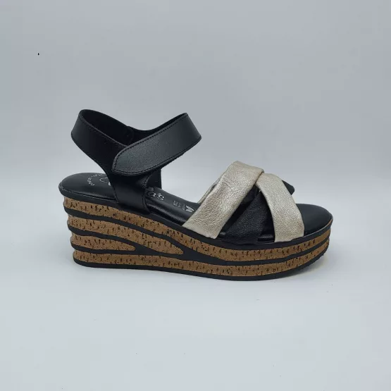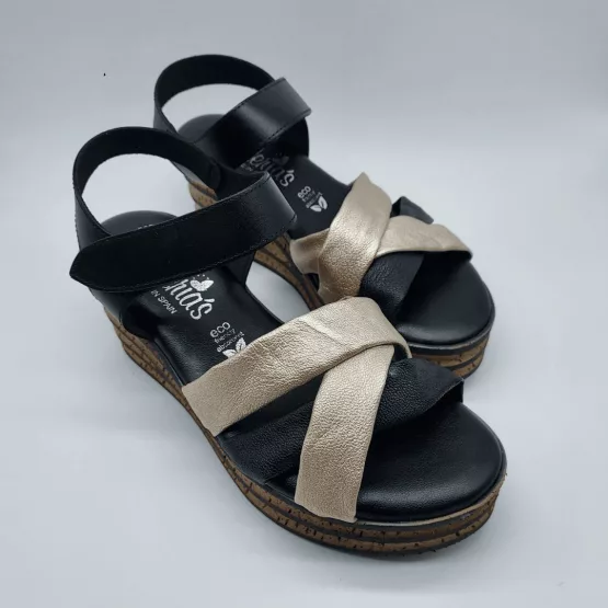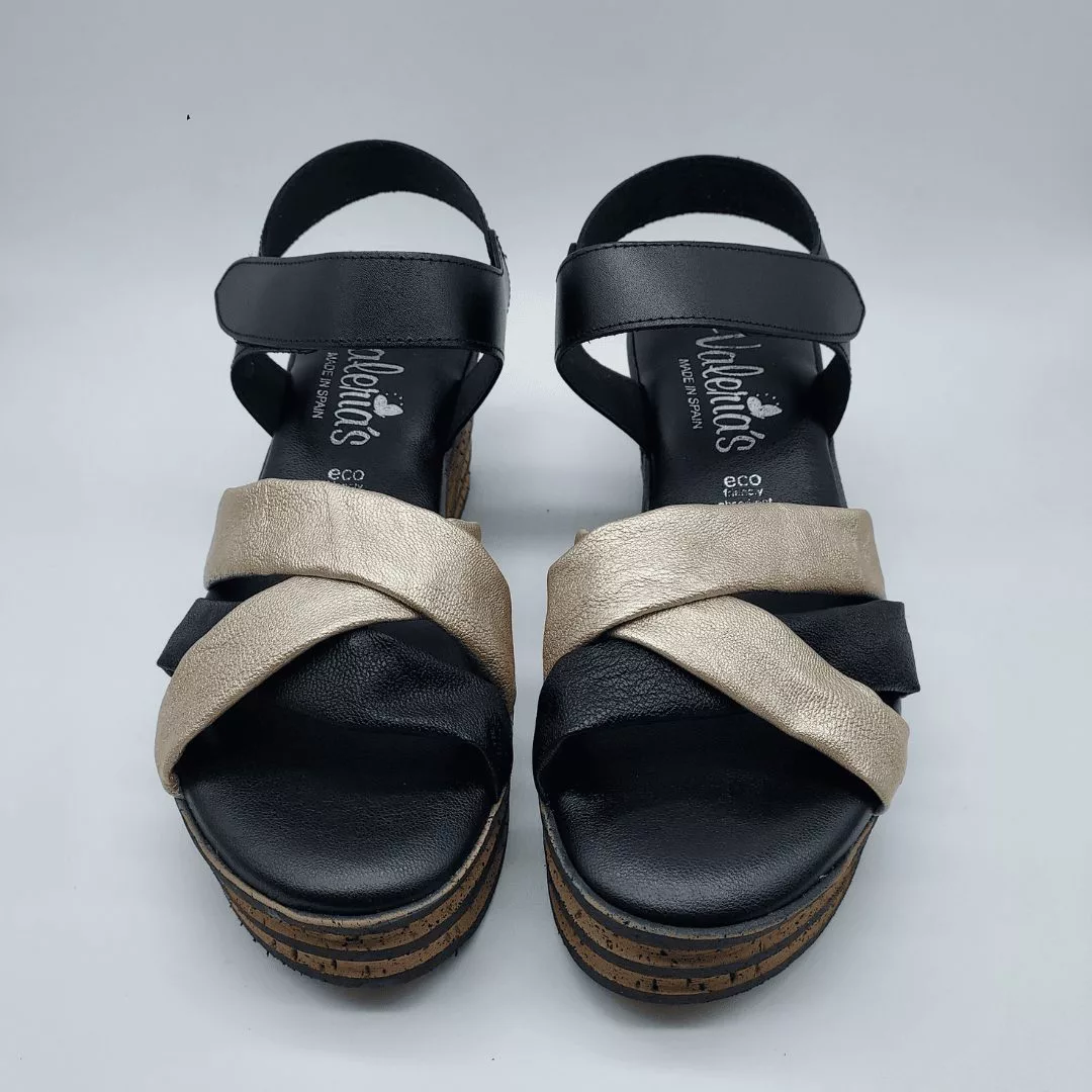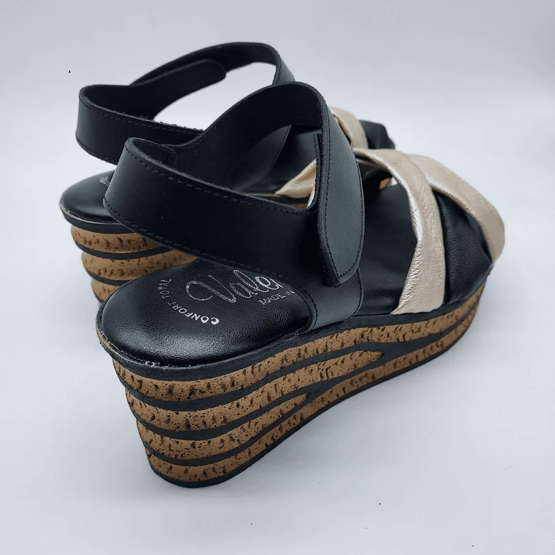 Valeria´s Mod. 1969, Sandalia en Piel acabado Negro combinado con Taupe, Cuña de 6,5 cm y plataforma de 2,5 cm, con Plantilla Confort Total Eco Friendly Absorbent, cierre mediante Velcro, Hecha en España.