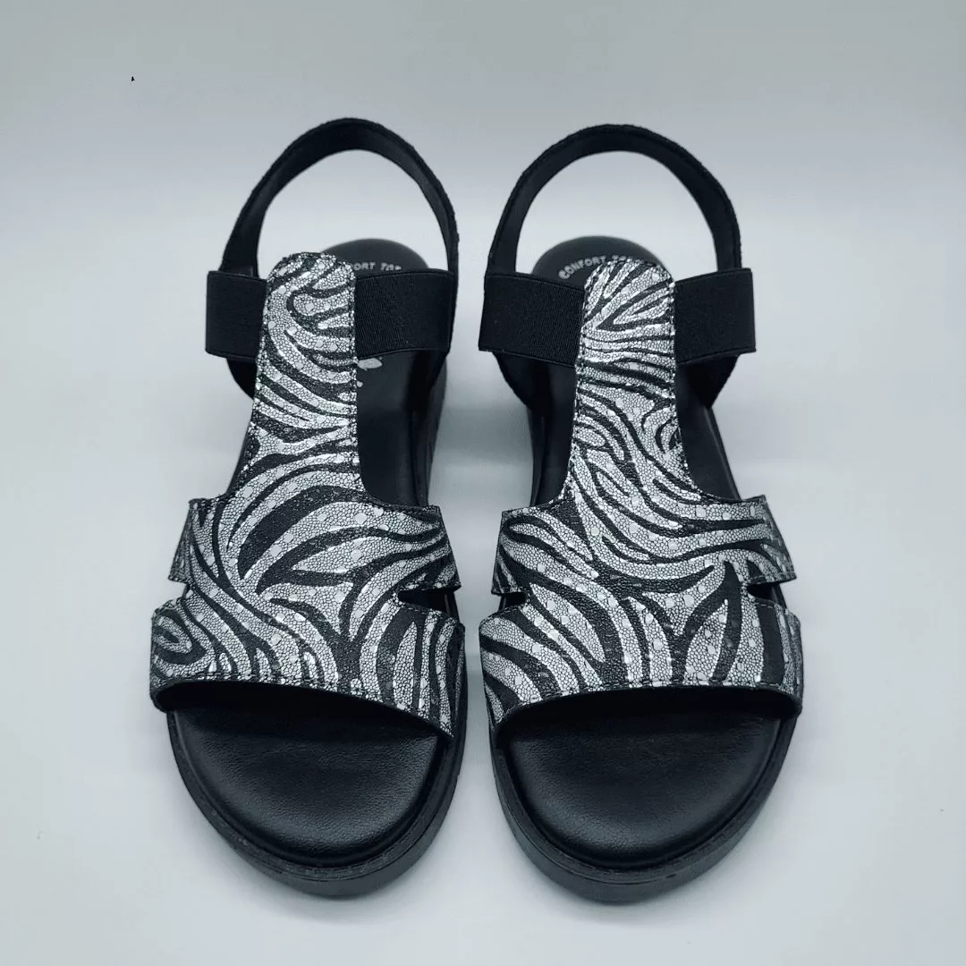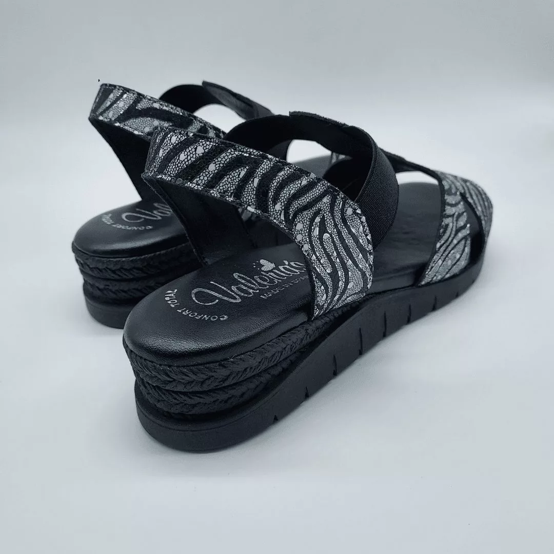 Valeria´s Mod. 2032, Sandalia en Piel acabado color Negro, Cuña de 3,5 cm, con Plantilla Confort Total Eco Friendly Absorbent, Suela Antideslizante, con Tiras Elásticas para facilitar su puesta, Hecha en España.