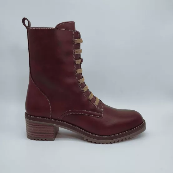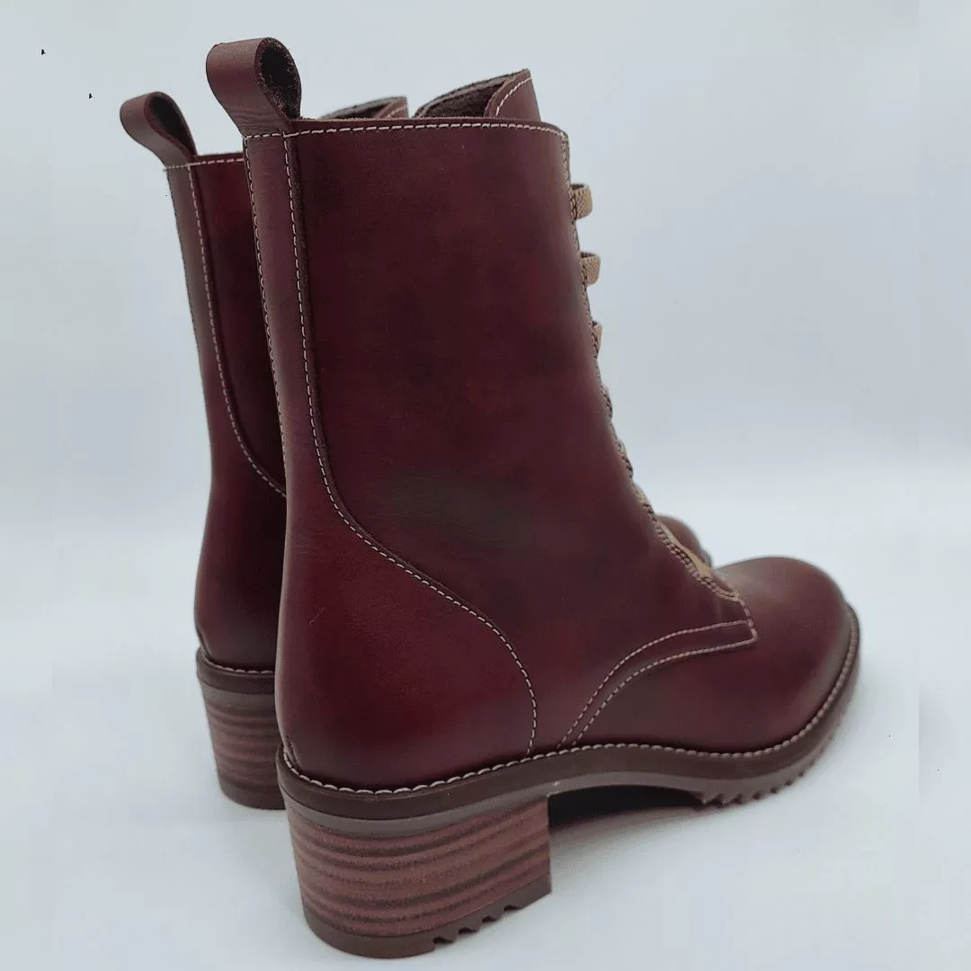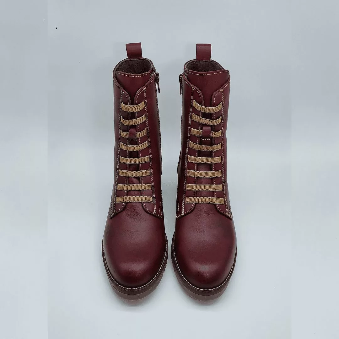Valeria´s Mod. 2325, Bota en Piel acabado color Burdeos con pespuntes en color Beige. Tacón Grueso de 4 cm. de altura, Interior Textil y Plantilla Confort Total Eco Friendly Absorbent Extraible. Suela Antideslizante. Cierre mediante Cremallera Lateral con Cordones Elásticos al tono para facilitar su puesta. Hecha en España.