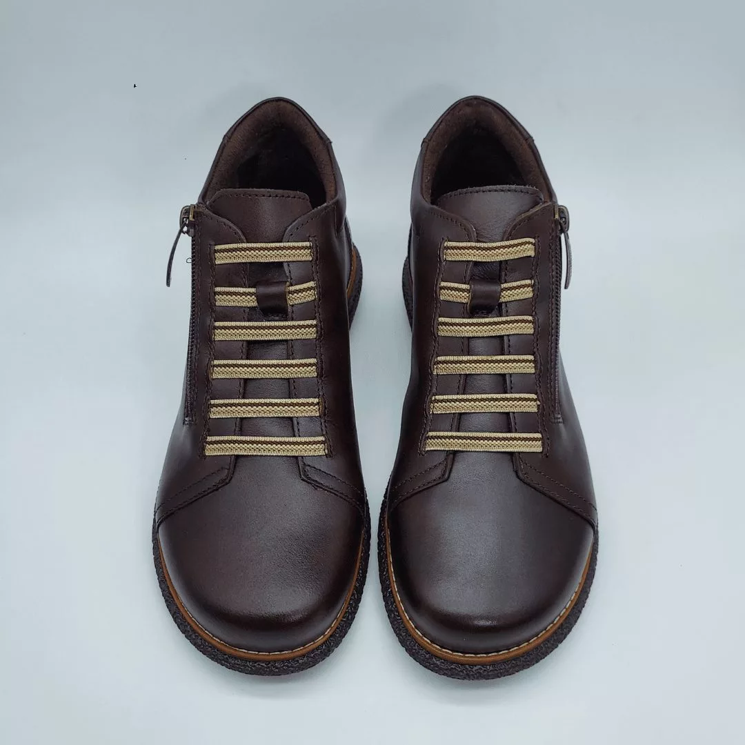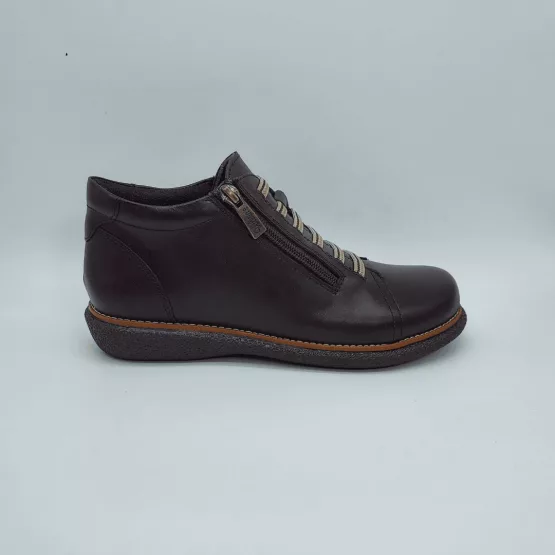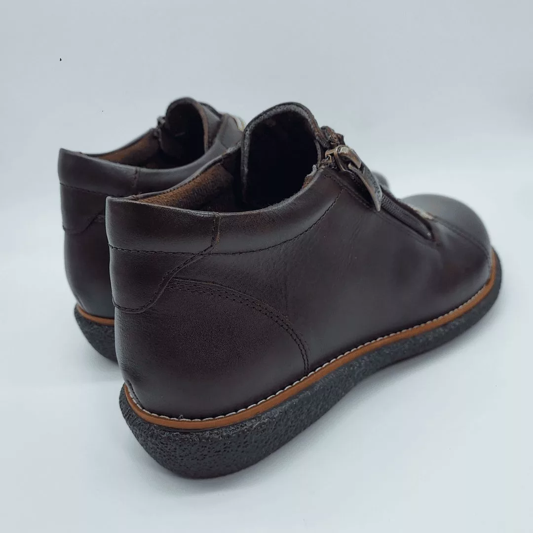 Valeria´s Mod. 2354, Zapato Abotinado en Piel acabado color Marrón. Cuña Baja de 2,5 cm. de altura, Interior Textil y Plantilla Confort Total Eco Friendly Absorbent Extraible. Suela Antideslizante. Cierre mediante Cremallera Lateral y Cordones Elásticos para facilitar su puesta. Hecho en España.