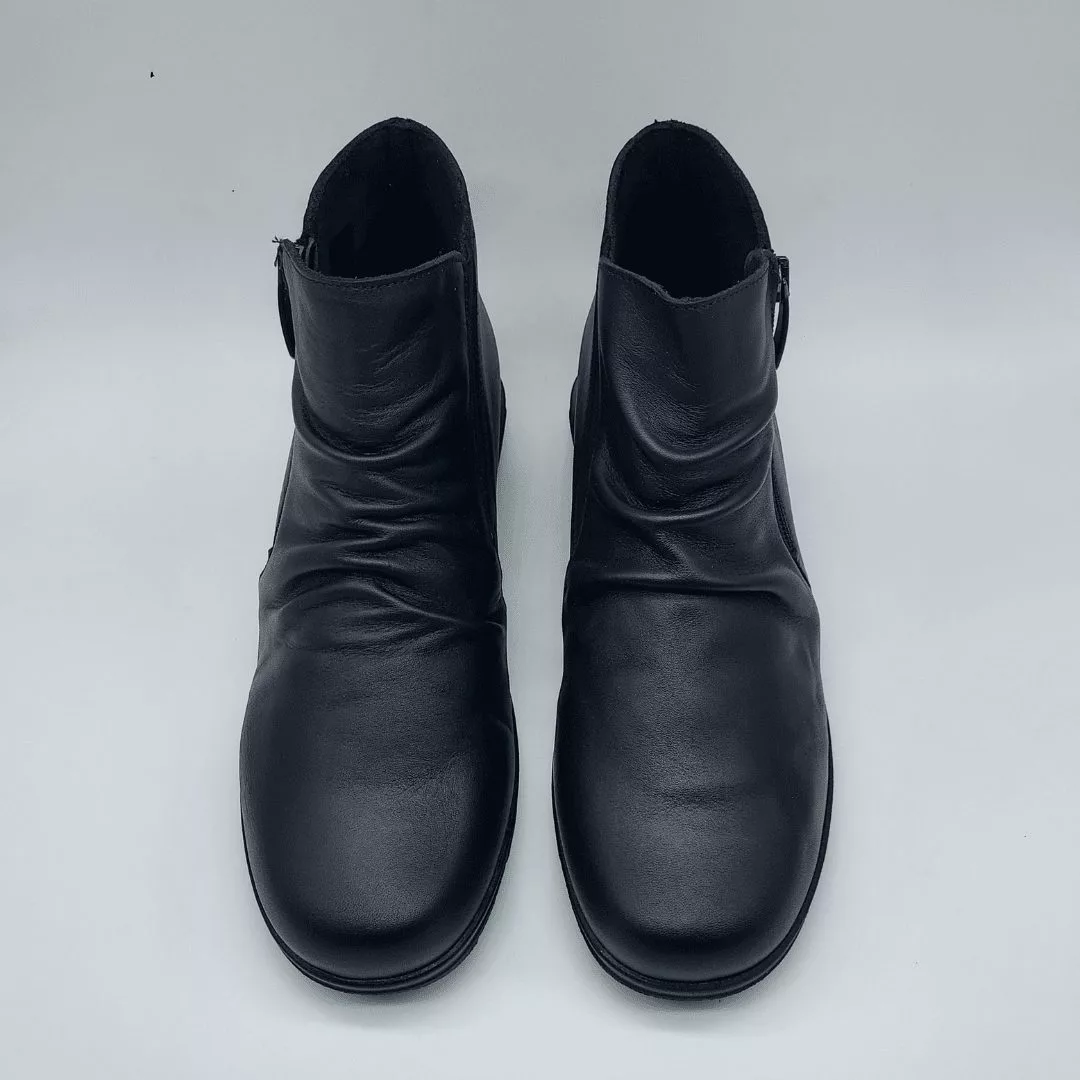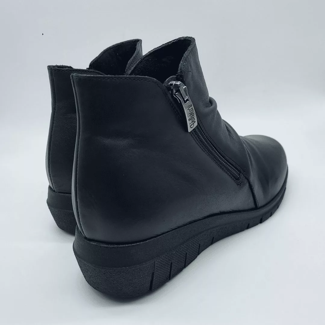 Valeria´s Mod. 2378, Botín en Piel acabado color Negro. Cuña Baja de 2,5 cm. de altura, Interior Textil y Plantilla Confort Total Eco Friendly Absorbent Extraible. Suela Antideslizante. Cierre mediante Cremallera Lateral y Parte Elástica para facilitar su puesta. Hecho en España.