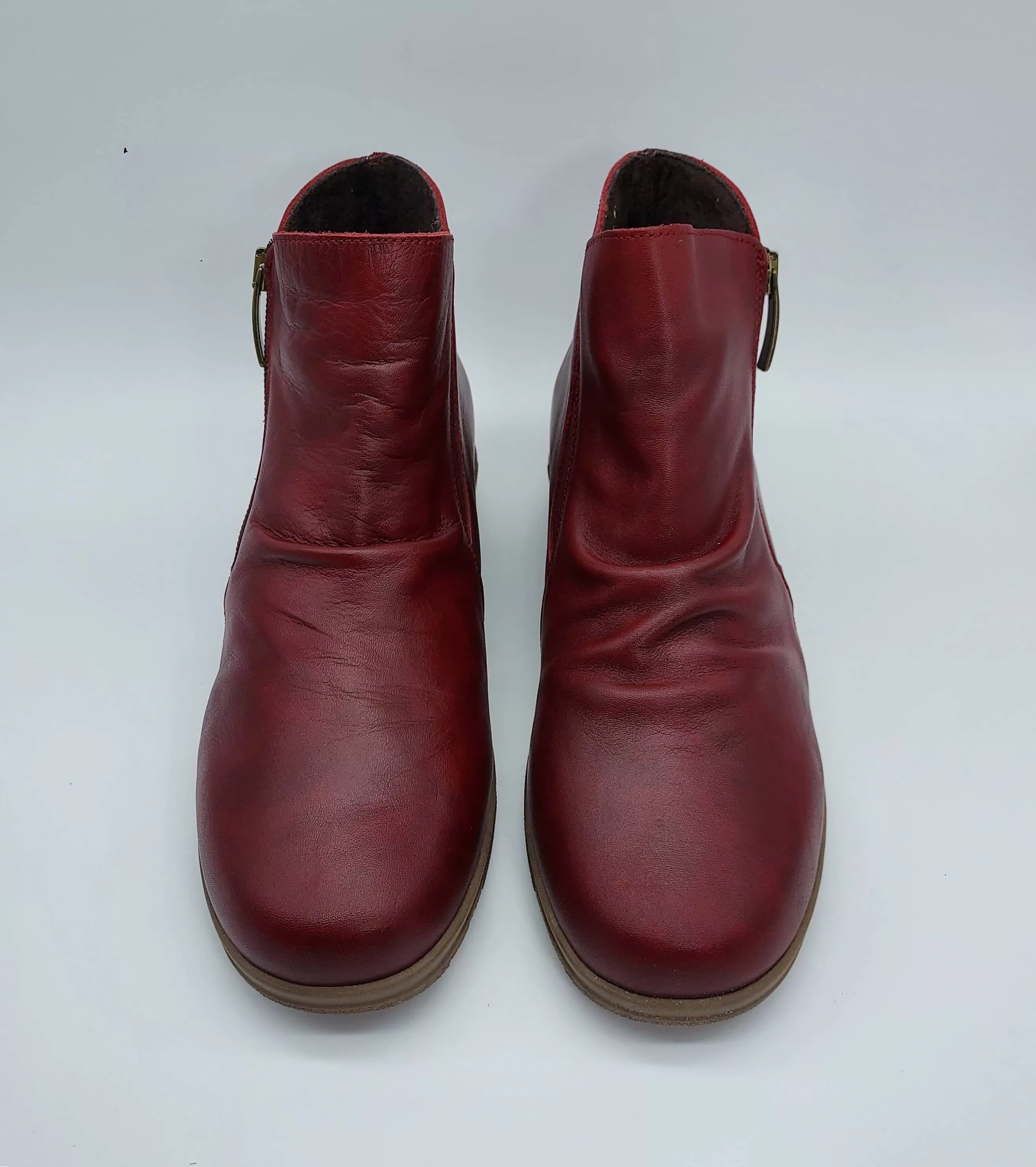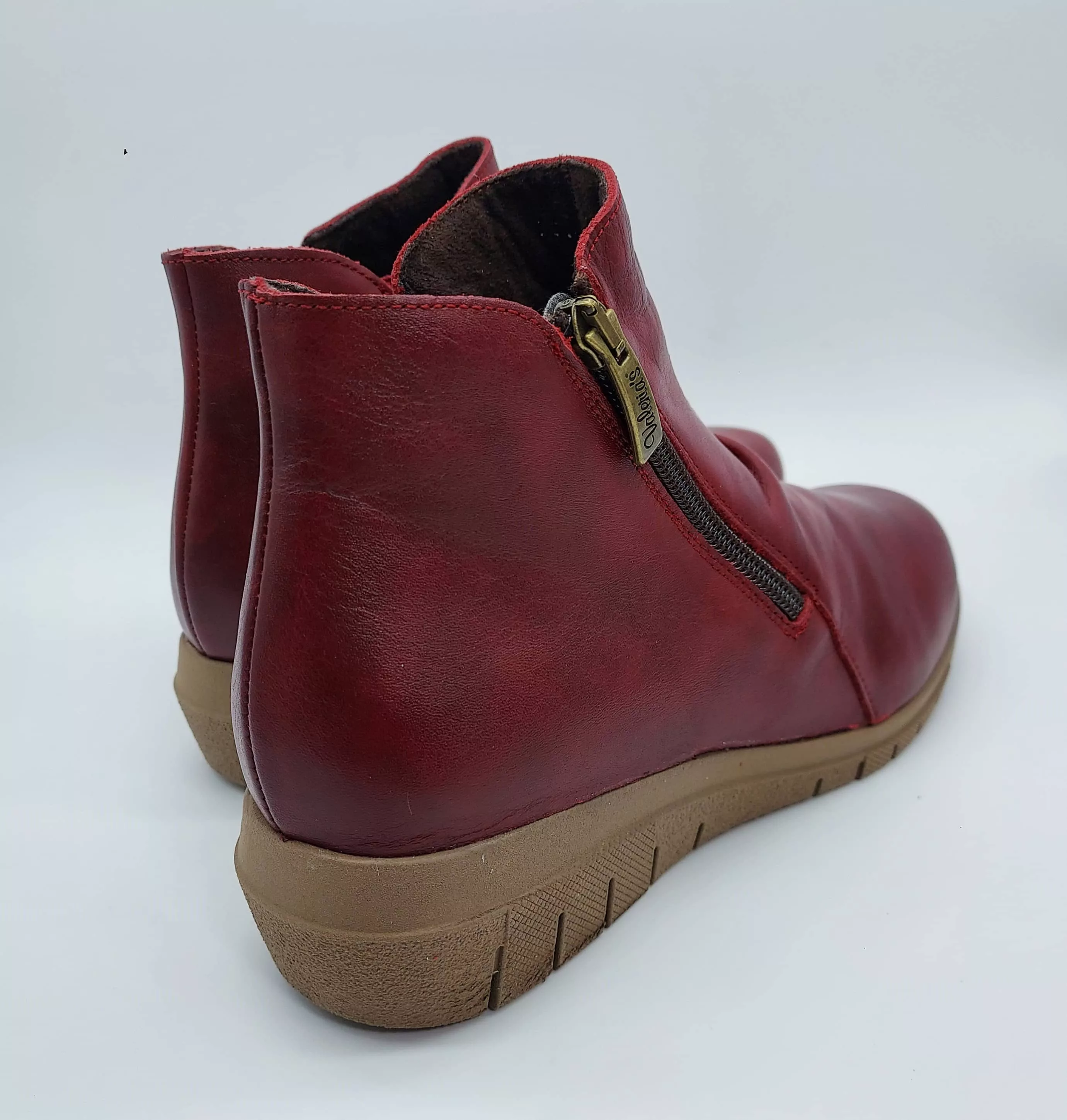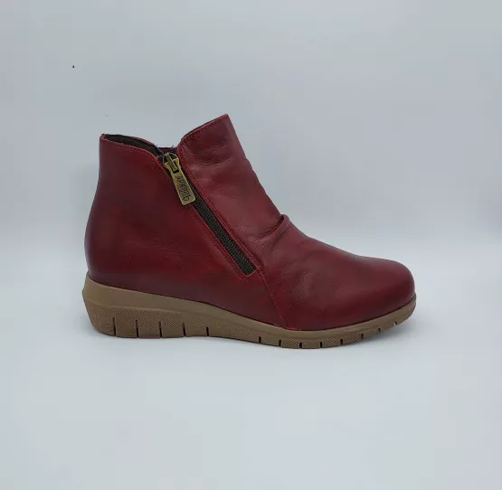 Valeria´s Mod. 2378, Botín en Piel acabado color Burdeos. Cuña Baja de 2,5 cm. de altura, Interior Textil y Plantilla Confort Total Eco Friendly Absorbent Extraible. Suela Antideslizante. Cierre mediante Cremallera Lateral y Parte Elástica para facilitar su puesta. Hecho en España.