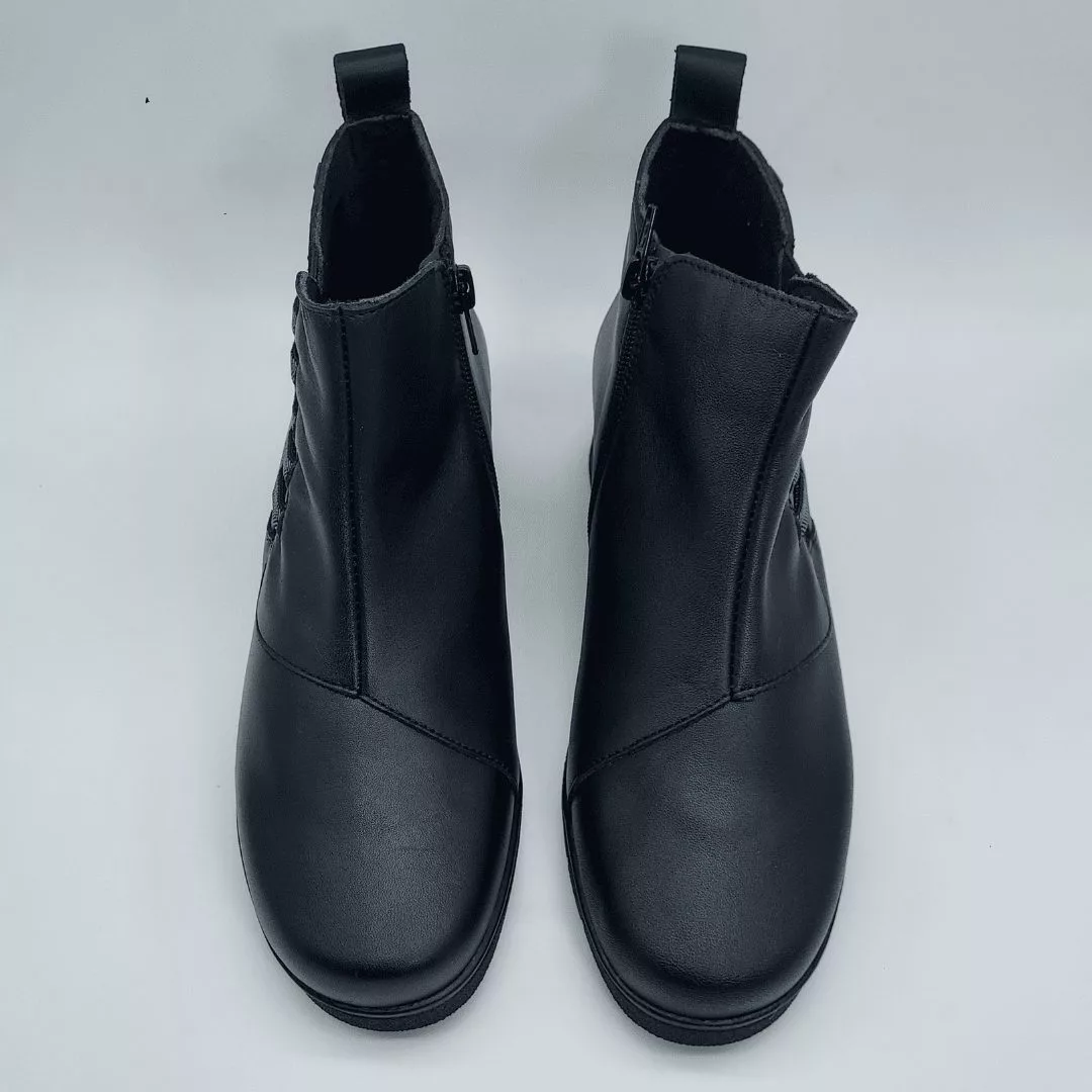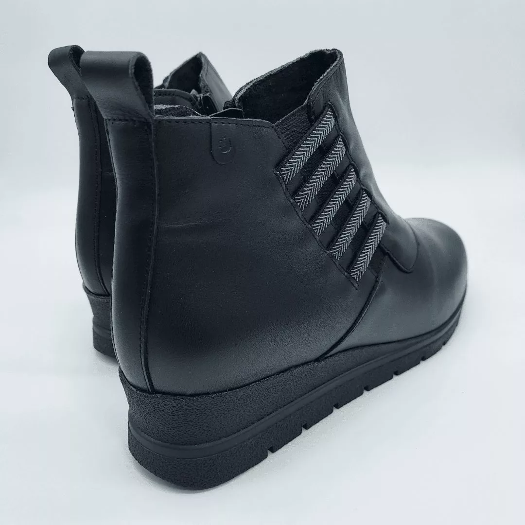 Valeria´s Mod. 9501, Botín Comfort en Piel acabado color Negro. Cuña Baja de 2,5 cm. de altura, Interior Textil y Plantilla Confort Total Eco Friendly Absorbent Extraible. Suela Antideslizante. Cierre mediante Cremallera Lateral y Cordones Elásticos para facilitar su puesta. Hecho en España.