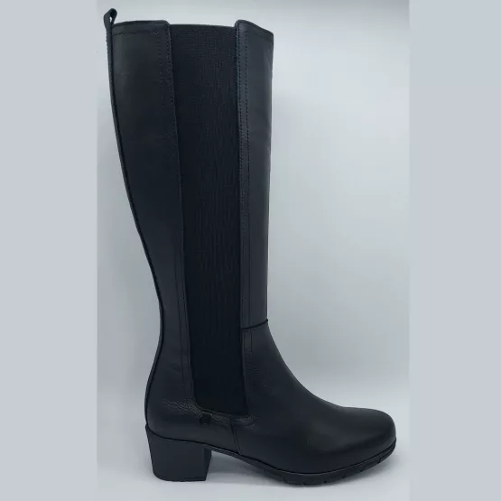 Valeria´s Mod. 9545, Bota Comfort en Piel de Caña Alta acabado color Negro. Tacón Grueso de 4 cm. de altura, Interior Textil y Plantilla Confort Total Eco Friendly Absorbent Extraible. Suela Antideslizante. Cierre mediante Cremallera Lateral con Parte Elástica para facilitar su puesta. Hecha en España.