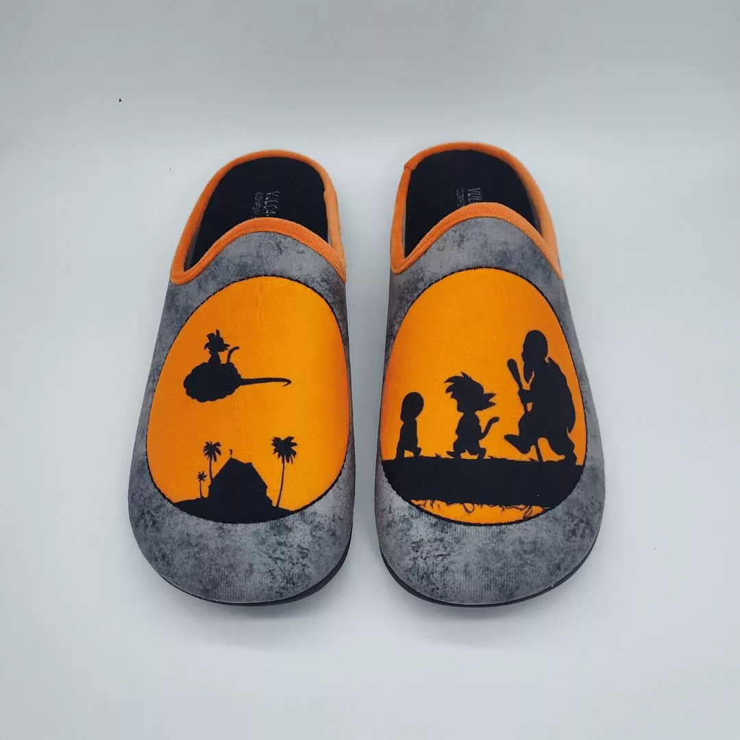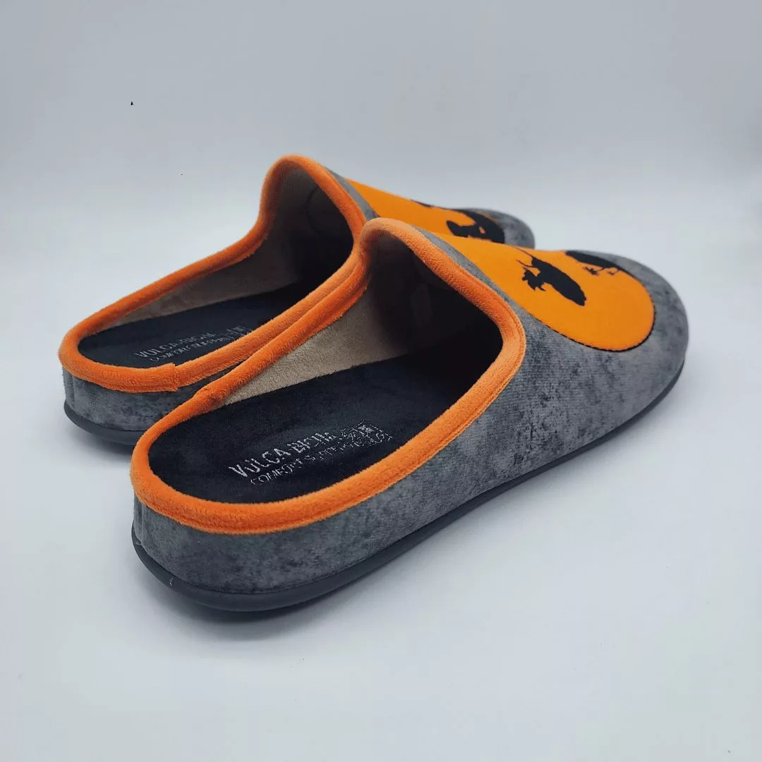 Vulca-Bicha Mod. 1823, Zapatilla Plana de Invierno para Hombre, confeccionada en Tejido Estampado acabado Grenoble Gris-Naranja, con Plantilla Acolchada Extraible. Suela de Caucho Natural. Hecha en España.