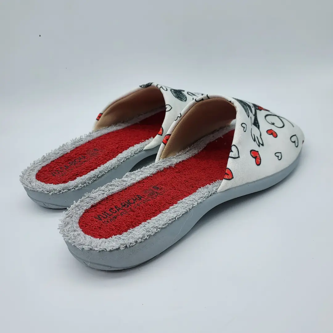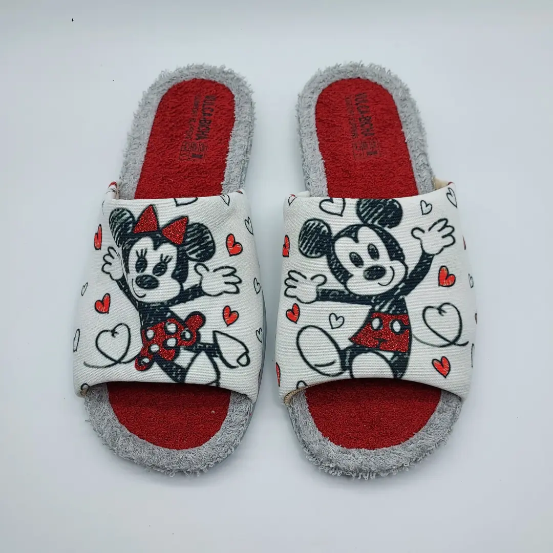 Vulca-Bicha Mod. 2918, Zapatilla Abierta Plana acabado Pique color Perla combinado con Rojo con imagen de ratones en pala, Suela de Goma. Hecha en España.