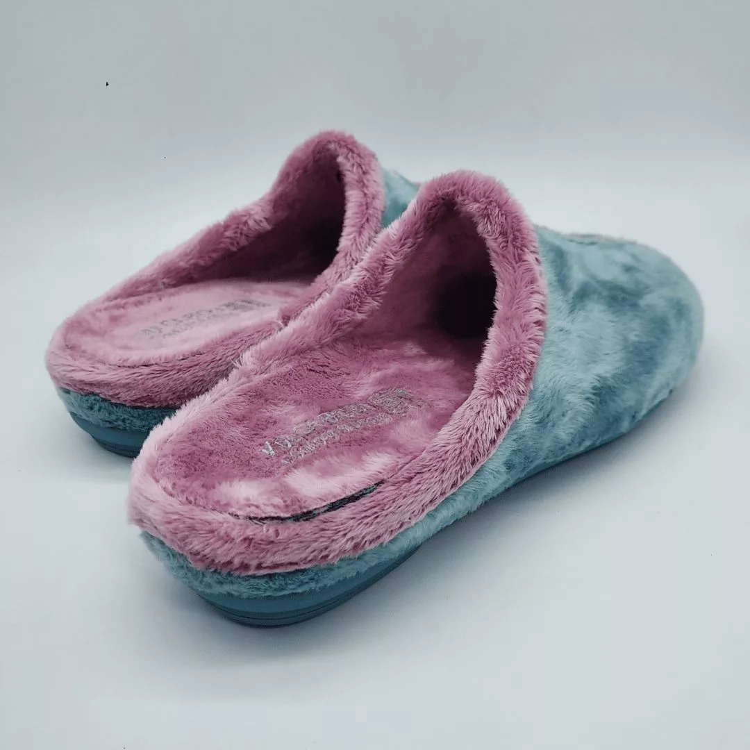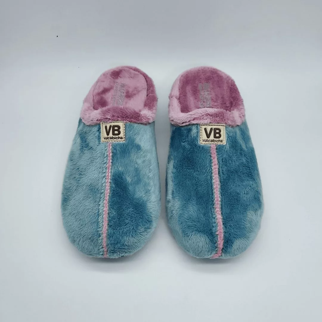 Vulca-Bicha Mod. 4311, Zapatilla Plana de Invierno para Mujer, confeccionada en Tejido Aterciopelado y Grabado acabado Suatex Turquesa/Malva, con Plantilla Acolchada Extraible. Suela de Caucho. Hecha en España.