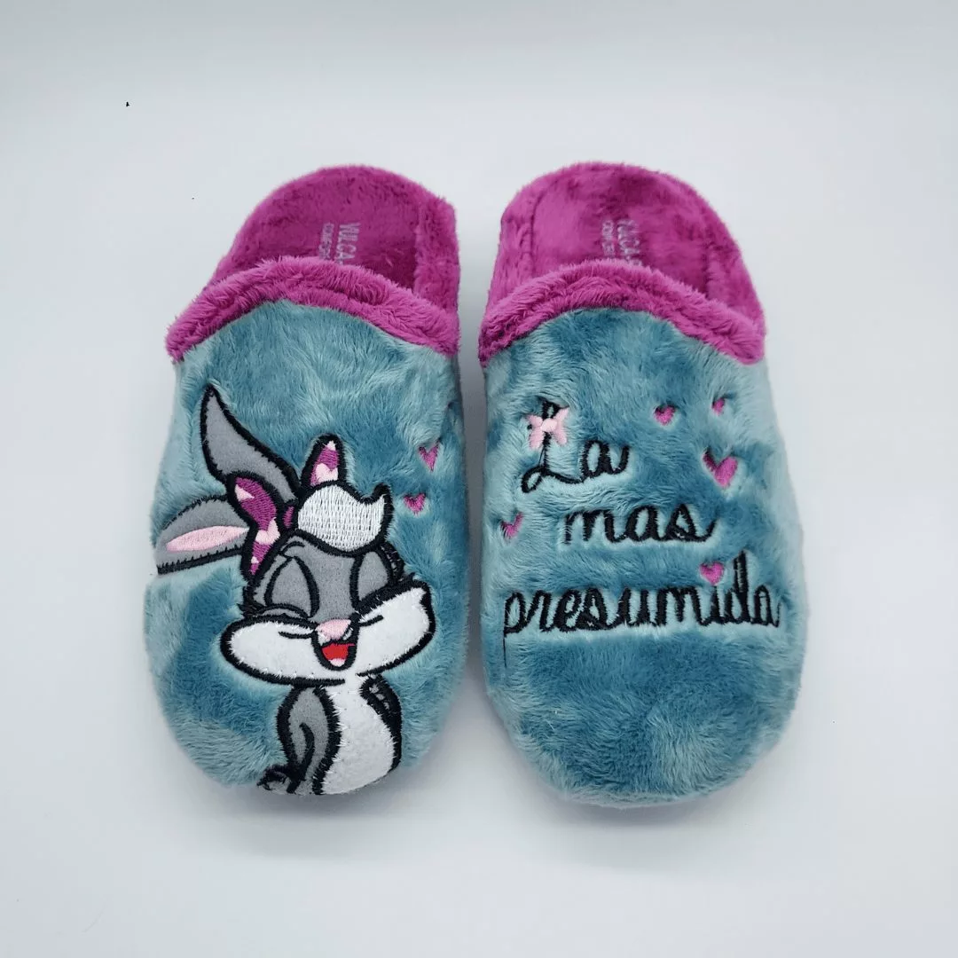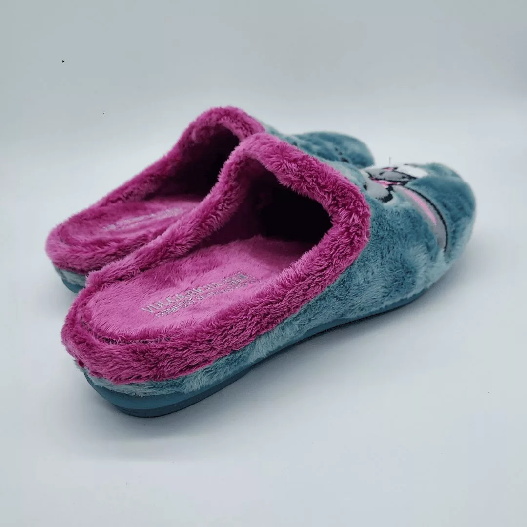 Vulca-Bicha Mod. 4346, Zapatilla Plana de Invierno para Mujer, confeccionada en Tejido Estampado y Grabado acabado Suatex Turquesa/Frambuesa, con Plantilla Acolchada Extraible. Suela de Caucho. Hecha en España.