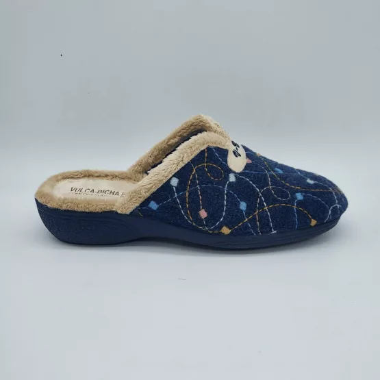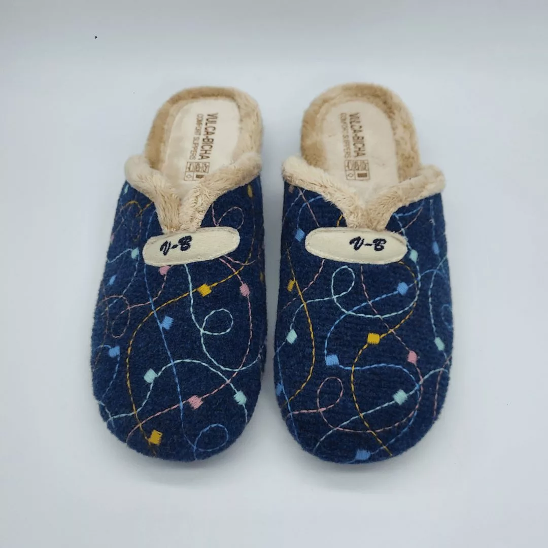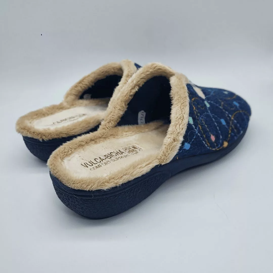 Vulca-Bicha Mod. 4731, Zapatilla de Invierno con Cuña para Mujer, confeccionada en Textil acabado color Marino, con Abertura Central y Ribete de Pelo. Suela de Caucho Natural. Hecha en España.