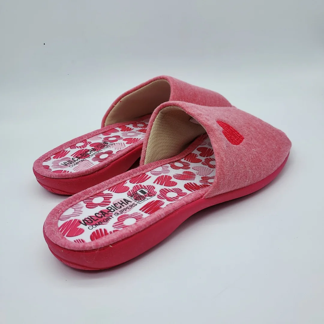 Vulca-Bicha Mod. 4904, Zapatilla Abierta Plana acabado Leplus color Fuxia con detalle de Corazón en pala, Suela de Goma. Hecha en España. Envío, Devolución y Reembolso