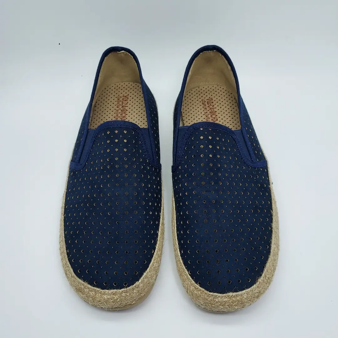 Vulca-Bicha Mod. 638, Alpargata para Hombre confeccionada en Tejido Textil Calado acabado Carolina color Marino, Suela de Caucho con adornos en Yute Trenzados. Plantilla Extraible. Hecha en España.