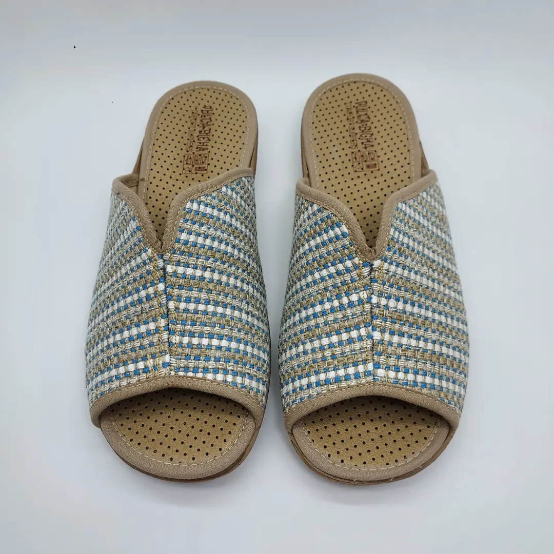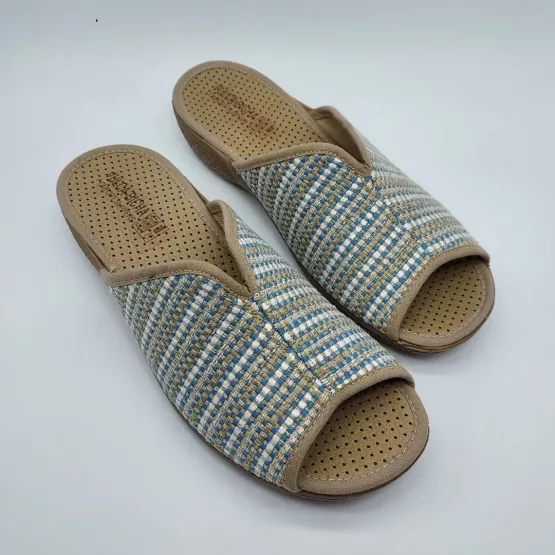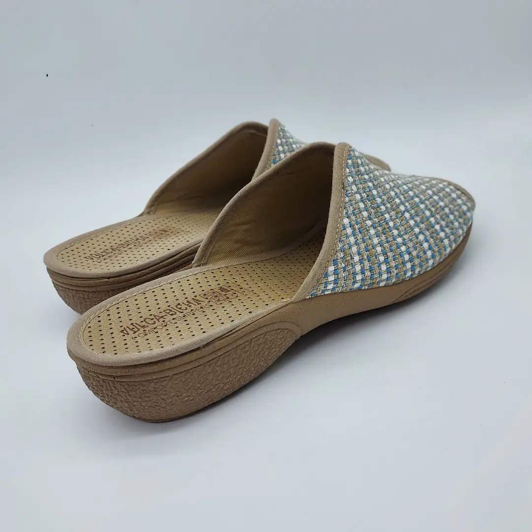 Vulca-Bicha Mod. 732, Zapatilla Abierta acabado Aldora color Azafata, con Cuña de 2,5 cm. de altura, con Abertura Central en Pala para facilitar su puesta, Suela de Goma. Hecha en España.
