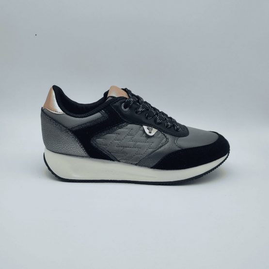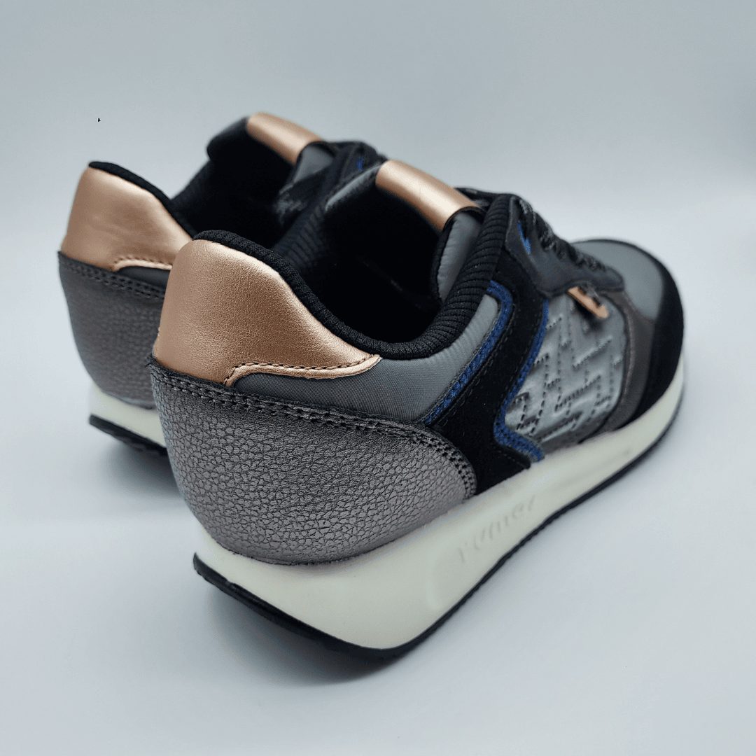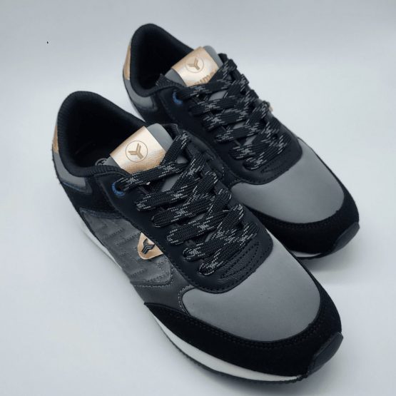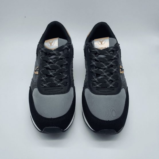 Yumas Mod. 53374, Sneaker en Serraje Sintético combinado con Textil acabado Abba color Plomo, Plantilla Extraible Confort Látex, Piso de Caucho, Cierre mediante Cordones Planos al tono.